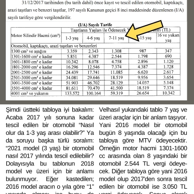 Velhasıl yukarıdaki tablo 7 yaş ve üzeri araçlar için bir anlam taşıyor. Yani 2016 model bir otomobil bugün 8 yaşında olacağı için bu tabloya göre MTV ödeyecektir. Örneğin motor hacmi 1301-1600 cc arasında olan 8 yaşındaki bir otomobil 2.544 TL vergi ödeyecek. Diğer tabloya göre yani 2016 model olup 2017'den sonra tescil edilen bir otomobil ise 3.050 TL vergi ödeyecek. Sonuç olarak tablo üzerinde biraz kafa yormak gerekiyor.