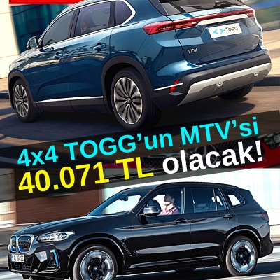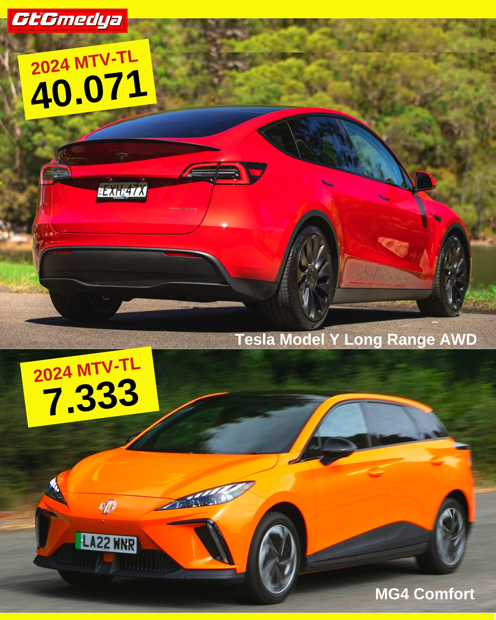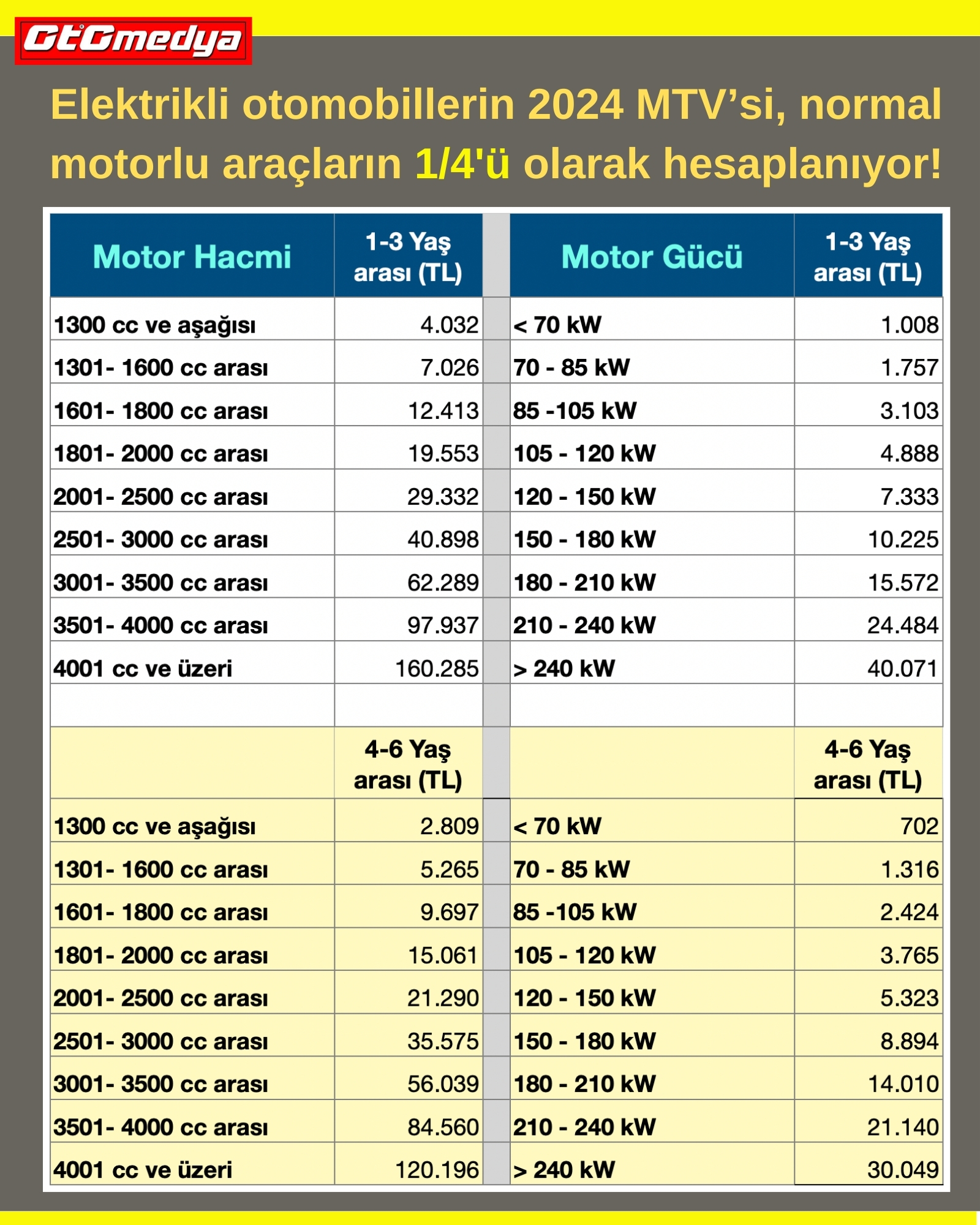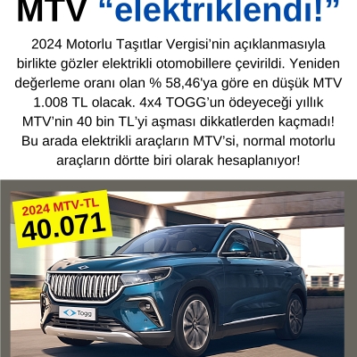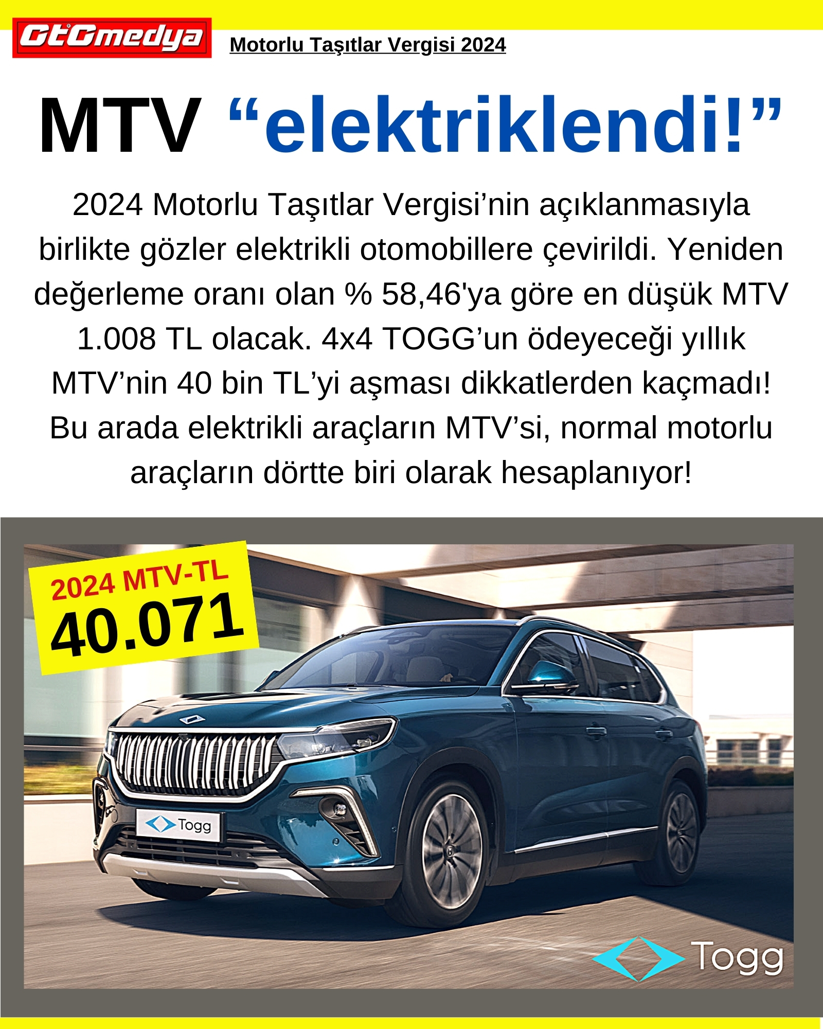 2024 Motorlu Taşıtlar Vergisi’nin açıklanmasıyla birlikte gözler elektrikli otomobillere çevirildi. Yeniden değerleme oranı olan % 58,46'ya göre en düşük MTV 1.008 TL olacak. 4x4 TOGG’un ödeyeceği yıllık MTV’nin 40 bin TL’yi aşması dikkatlerden kaçmadı! Bu arada elektrikli araçların MTV’si, normal motorlu araçların dörtte biri olarak hesaplanıyor!