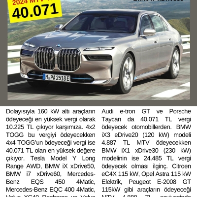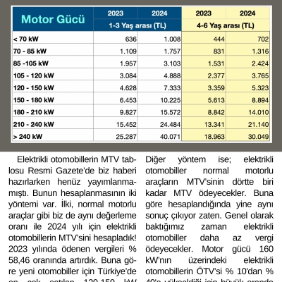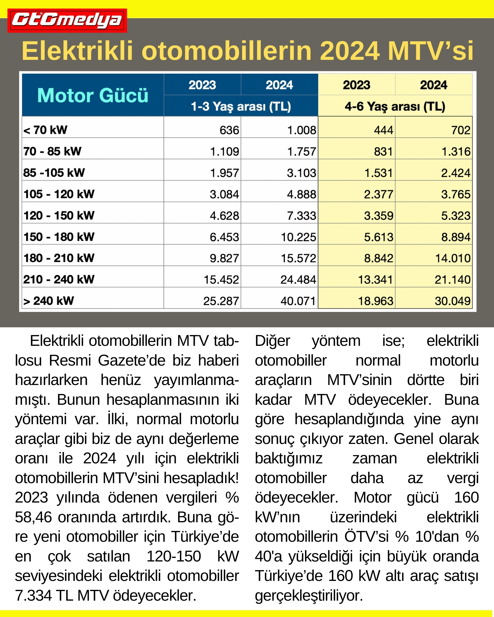 Elektrikli otomobillerin MTV tab-losu Resmi Gazete’de biz haberi hazırlarken henüz yayımlanma-mıştı. Bunun hesaplanmasının iki yöntemi var. İlki, normal motorlu araçlar gibi biz de aynı değerleme oranı ile 2024 yılı için elektrikli otomobillerin MTV’sini hesapladık! 2023 yılında ödenen vergileri % 58,46 oranında artırdık. Buna gö-re yeni otomobiller için Türkiye’de en çok satılan 120-150 kW seviyesindeki elektrikli otomobiller 7.334 TL MTV ödeyecekler.