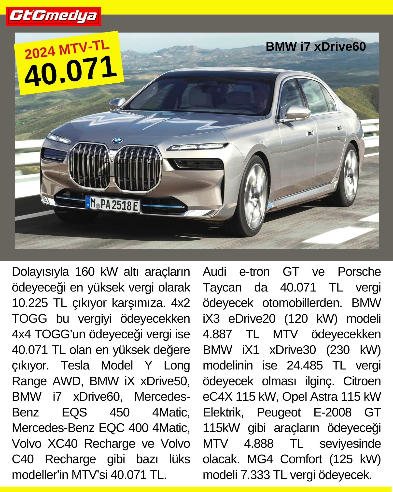 Dolayısıyla 160 kW altı araçların ödeyeceği en yüksek vergi olarak 10.225 TL çıkıyor karşımıza. 4x2 TOGG bu vergiyi ödeyecekken 4x4 TOGG’un ödeyeceği vergi ise 40.071 TL olan en yüksek değere çıkıyor. Tesla Model Y Long Range AWD, BMW iX xDrive50, BMW i7 xDrive60, Mercedes-Benz EQS 450 4Matic, Mercedes-Benz EQC 400 4Matic, Volvo XC40 Recharge ve Volvo C40 Recharge gibi bazı lüks modeller’in MTV’si 40.071 TL.