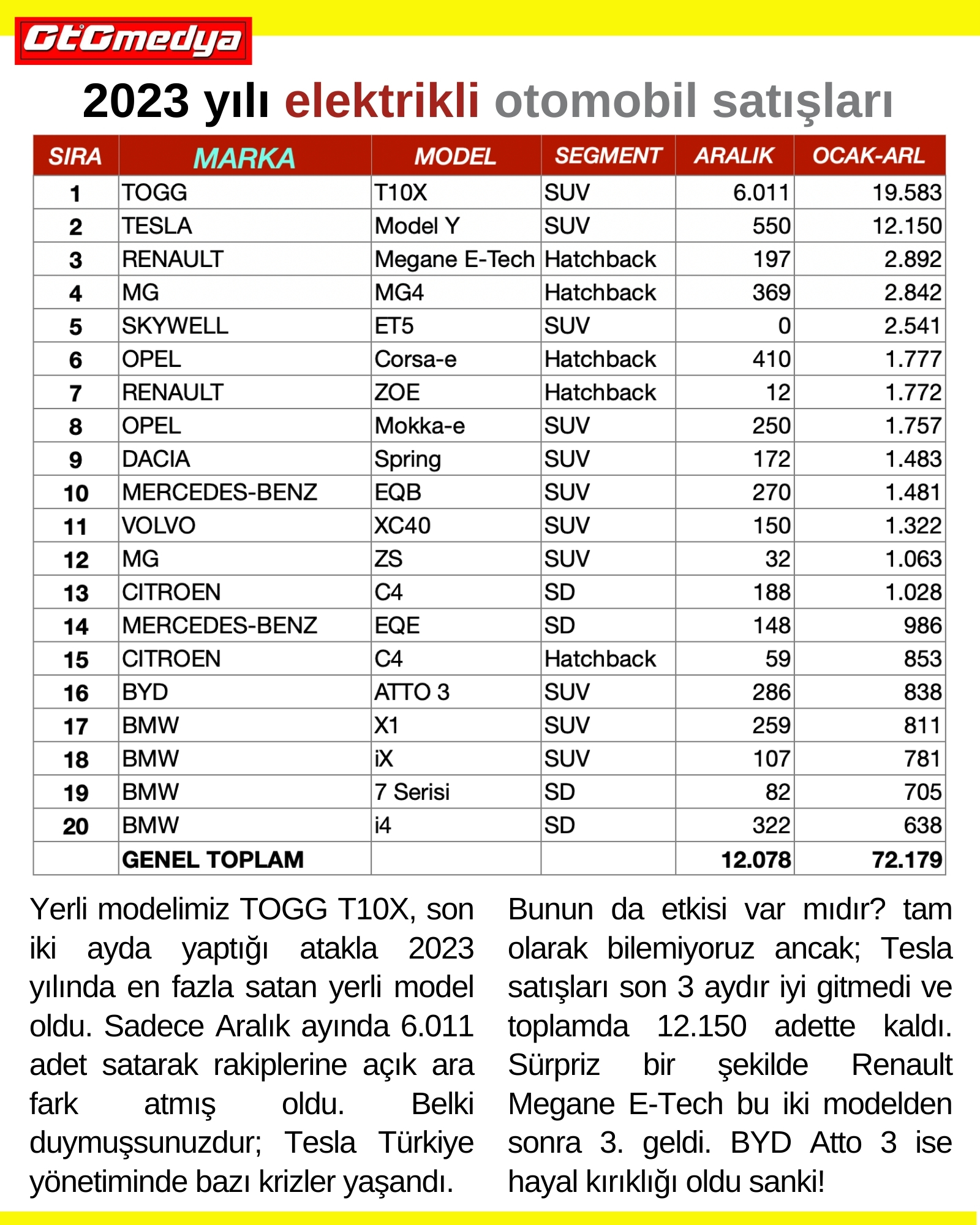 Yerli modelimiz TOGG T10X, son iki ayda yaptığı atakla 2023 yılında en fazla satan elektrikli model oldu. Sadece Aralık ayında 6.011 adet satarak rakiplerine açık ara fark atmış oldu. Belki duymuşsunuzdur; Tesla Türkiye yönetiminde bazı krizler yaşandı. Bunun da etkisi var mıdır? tam olarak bilemiyoruz ancak; Tesla satışları son 3 aydır iyi gitmedi ve toplamda 12.150 adette kaldı. Sürpriz bir şekilde Renault Megane E-Tech bu iki modelden sonra 3. geldi. BYD Atto 3 ise hayal kırıklığı oldu sanki!