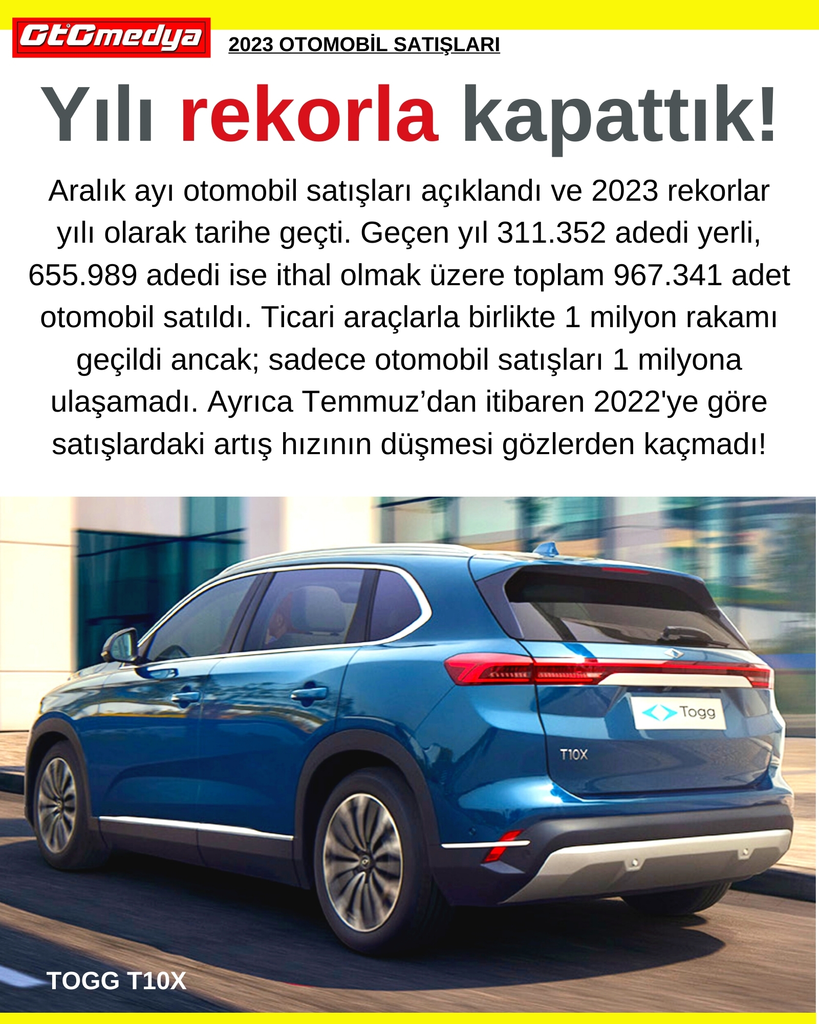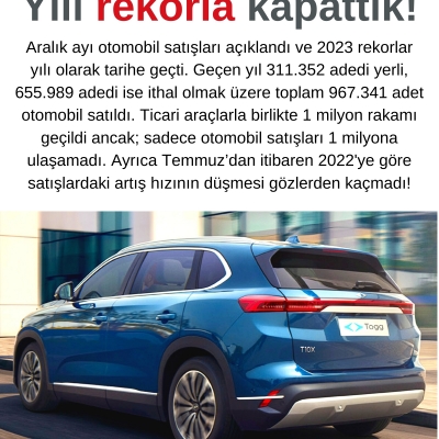 Aralık ayı otomobil satışları açıklandı ve 2023 rekorlar yılı olarak tarihe geçti. Geçen yıl 311.352 adedi yerli, 655.989 adedi ise ithal olmak üzere toplam 967.341 adet otomobil satıldı. Ticari araçlarla birlikte 1 milyon rakamı geçildi ancak; sadece otomobil satışları 1 milyona ulaşamadı. Ayrıca Temmuz’dan itibaren 2022'ye göre satışlardaki artış hızının düşmesi gözlerden kaçmadı!