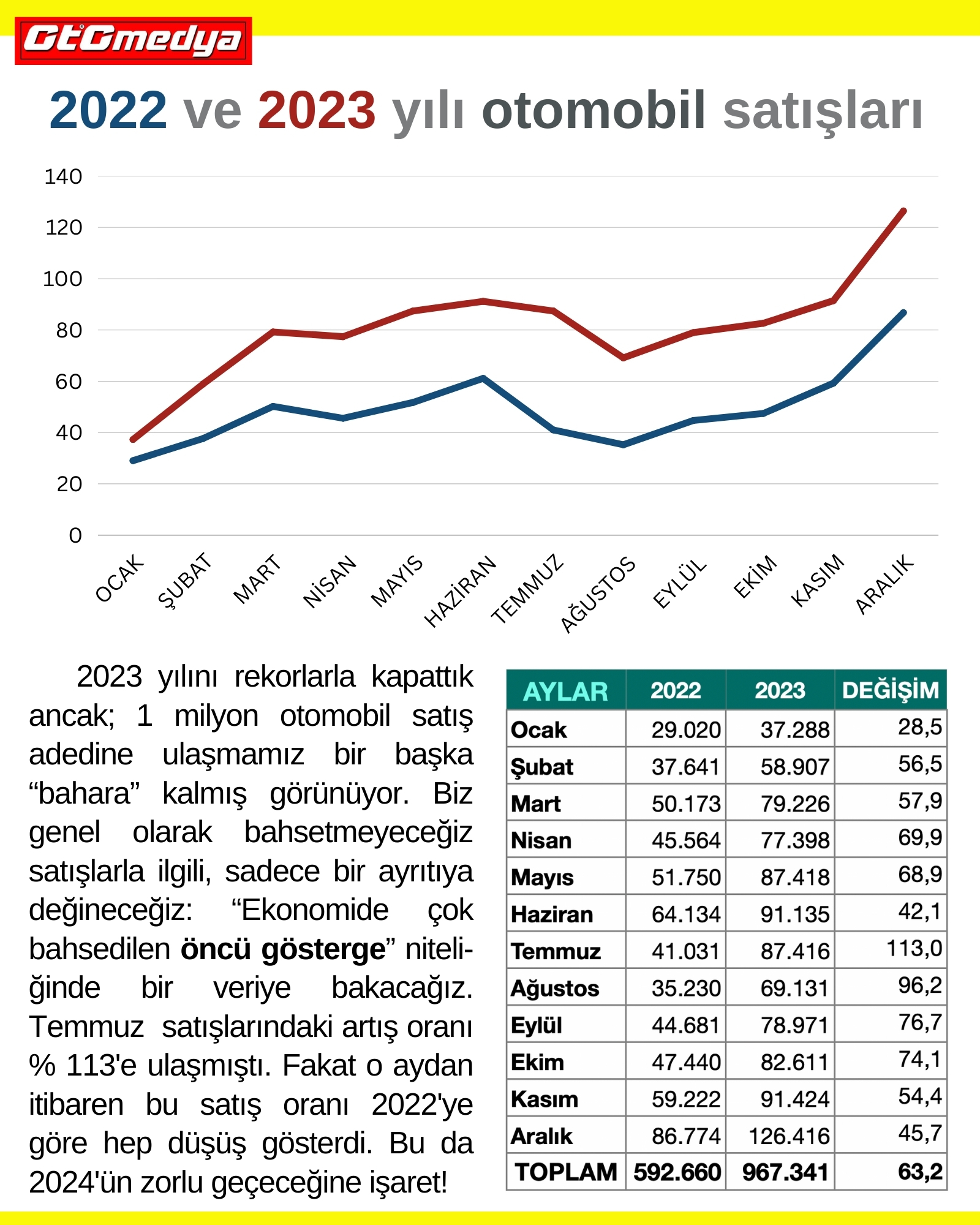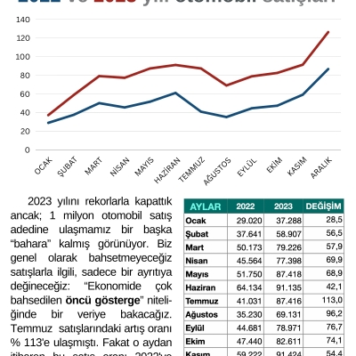 2023 yılını rekorlarla kapattık ancak; 1 milyon otomobil satış adedine ulaşmamız bir başka “bahara” kalmış görünüyor. Biz genel olarak bahsetmeyeceğiz satışlarla ilgili, sadece bir ayrıtıya değineceğiz: “Ekonomide çok bahsedilen öncü gösterge” niteliğinde bir veriye bakacağız. Temmuz satışlarındaki artış oranı % 113'e ulaşmıştı. Fakat o aydan itibaren bu satış oranı 2022'ye göre hep düşüş gösterdi. Bu da 2024'ün zorlu geçeceğine işaret!
