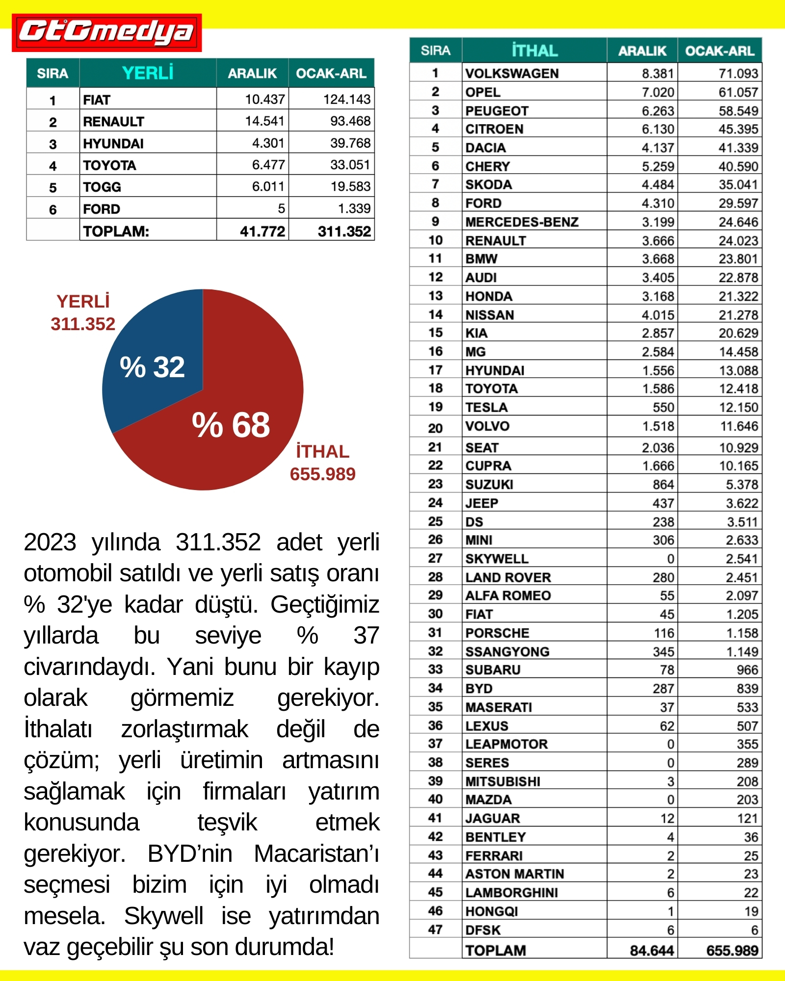 2023 yılında 311.352 adet yerli otomobil satıldı ve yerli satış oranı % 32'ye kadar düştü. Geçtiğimiz yıllarda bu seviye % 37 civarındaydı. Yani bunu bir kayıp olarak görmemiz gerekiyor. İthalatı zorlaştırmak değil de çözüm; yerli üretimin artmasını sağlamak için firmaları yatırım konusunda teşvik etmek gerekiyor. BYD’nin Macaristan’ı seçmesi bizim için iyi olmadı mesela. Skywell ise yatırımdan vaz geçebilir şu son durumda! (29 Aralık 2023 tarihinde yürürlüğe giren kanundan sonra!)