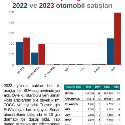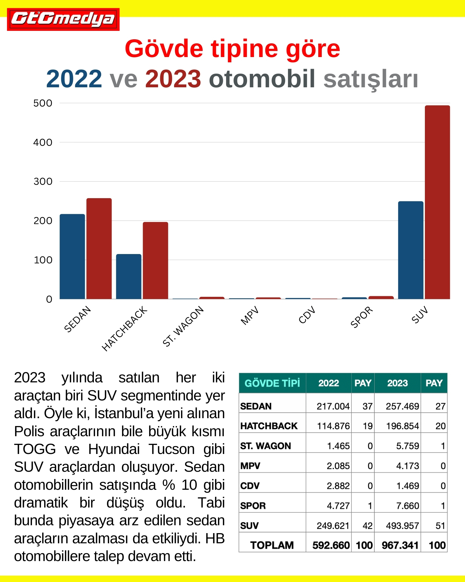 2023 yılında satılan her iki araçtan biri SUV segmentinde yer aldı. Öyle ki, İstanbul’a yeni alınan Polis araçlarının bile büyük kısmı TOGG ve Hyundai Tucson gibi SUV araçlardan oluşuyor. Sedan otomobillerin satışında % 10 gibi dramatik bir düşüş oldu. Tabi bunda piyasaya arz edilen sedan araçların azalması da etkiliydi. HB otomobillere talep devam etti.