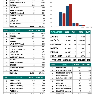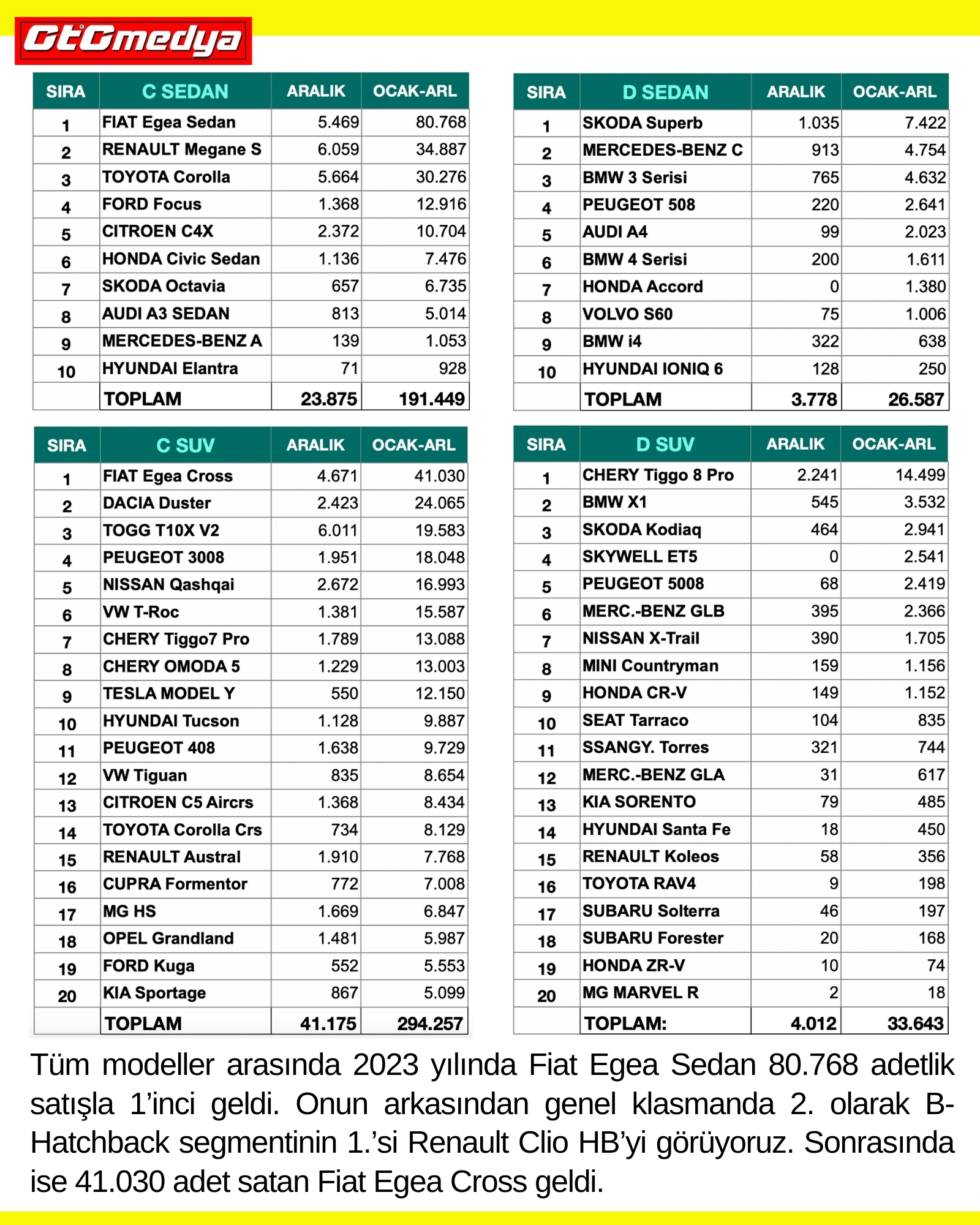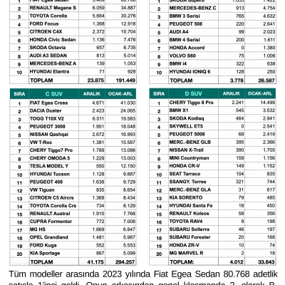 Tüm modeller arasında 2023 yılında Fiat Egea Sedan 80.768 adetlik satışla 1’inci geldi. Onun arkasından genel klasmanda 2. olarak B-Hatchback segmentinin 1.’si Renault Clio HB’yi görüyoruz. Sonrasında ise 41.030 adet satan Fiat Egea Cross geldi. 2023 yılında satılan otomobillerin % 56'sı C segmentinde yer aldı. Onu % 32 payla B segmenti ve % 7 payla D segmenti takip etti.