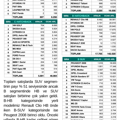 Toplam satışlarda SUV segmen-tinin payı % 51 seviyesinde ancak B segmentinde HB ve SUV satışları birbirine çok yakın geldi. B-HB kategorisinde yerli modelimiz Renault Clio HB önde iken B-SUV kategorisinde ise Peugeot 2008 birinci oldu. Önceki yıllarda B-HB kadar rağbet gören C-HB segmenti bu sefer B-HB’nin üçte biri kadar satışa ulaşabildi.