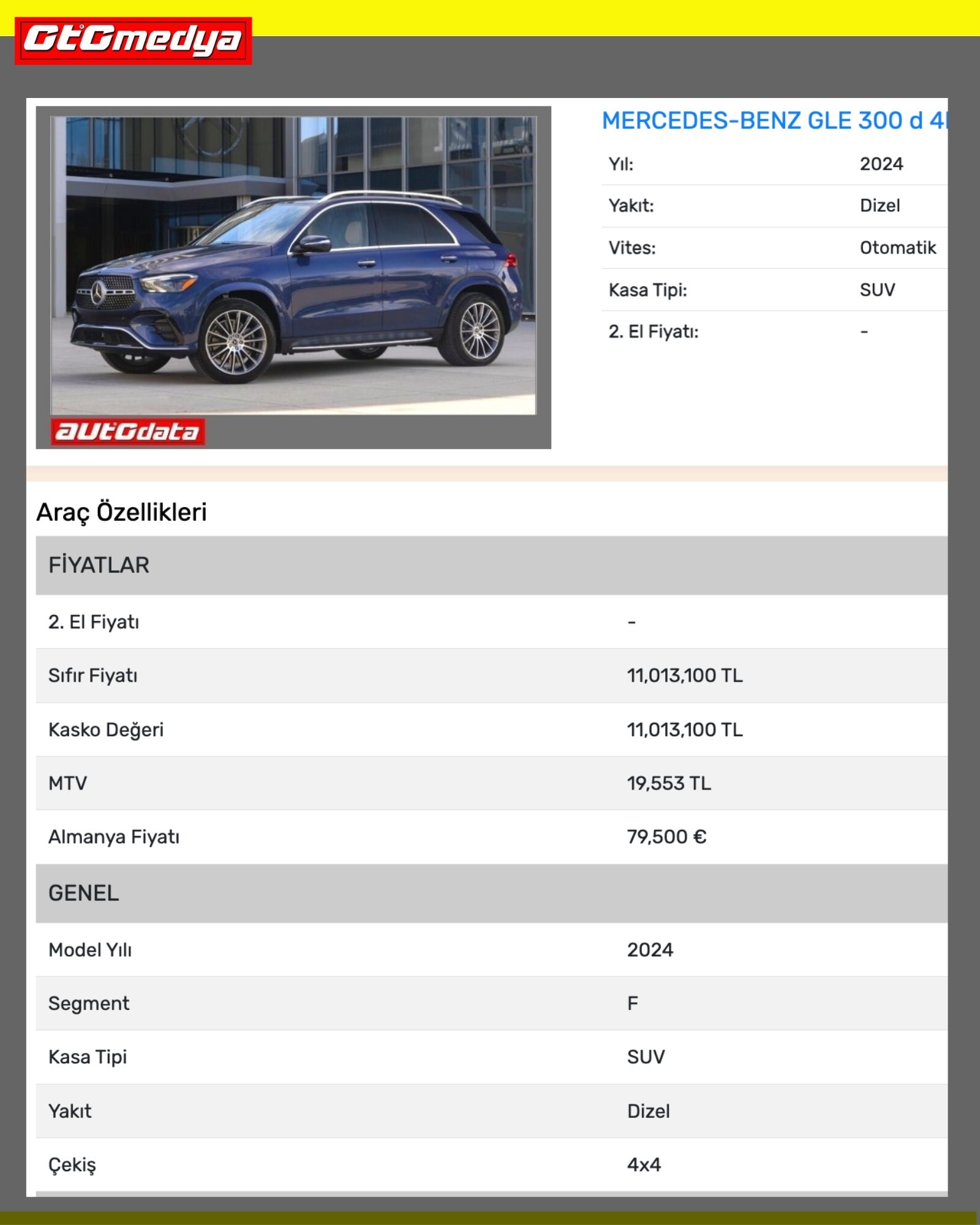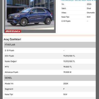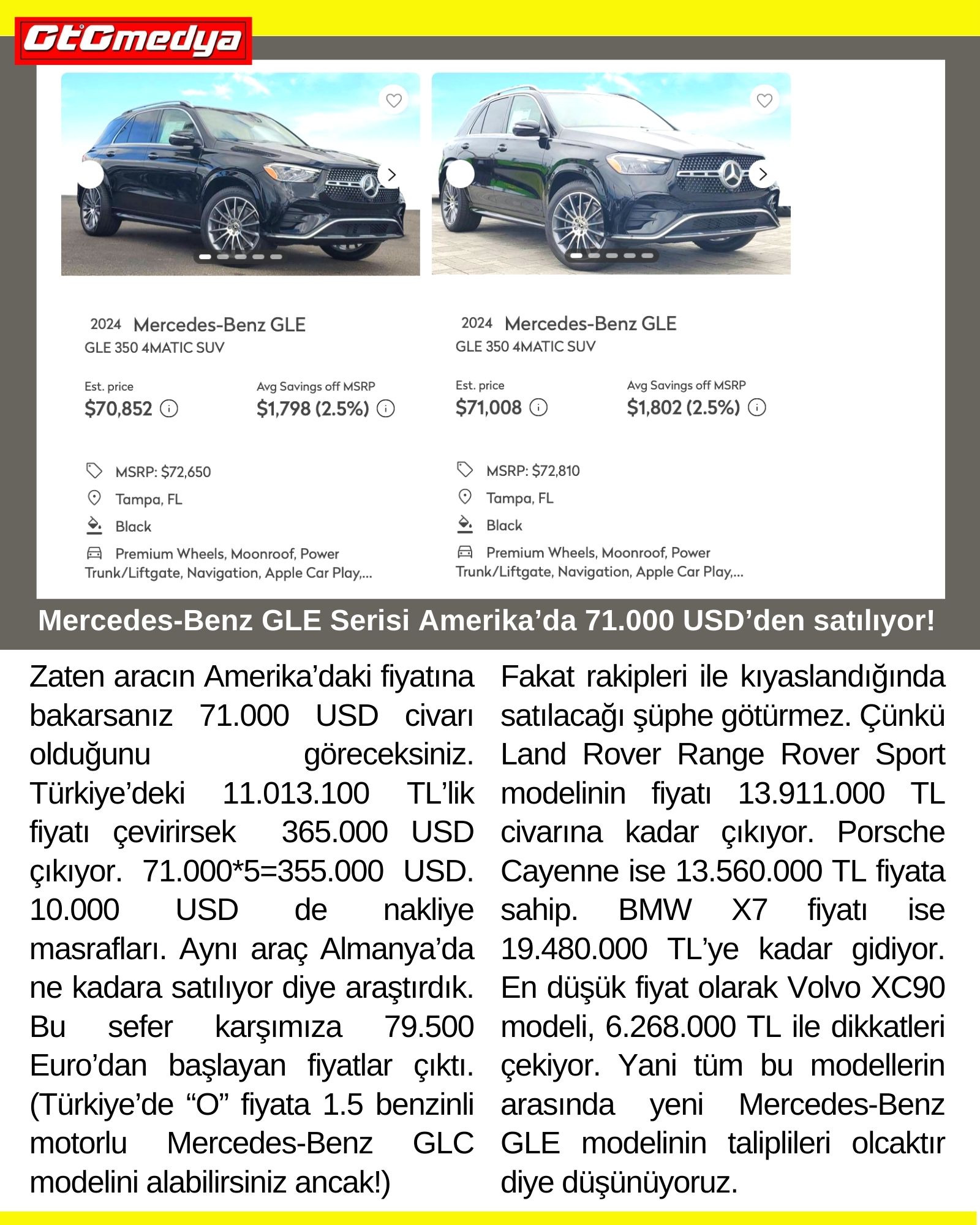 Zaten aracın Amerika’daki fiyatına bakarsanız 71.000 USD civarı olduğunu göreceksiniz. Türkiye’deki 11.013.100 TL’lik fiyatı çevirirsek 365.000 USD çıkıyor. 71.000*5=355.000 USD. 10.000 USD de nakliye masrafları. Aynı araç Almanya’da ne kadara satılıyor diye araştırdık. Bu sefer karşımıza 79.500 Euro’dan başlayan fiyatlar çıktı. (Türkiye’de “O” fiyata 1.5 benzinli motorlu Mercedes-Benz GLC modelini alabilirsiniz ancak!)