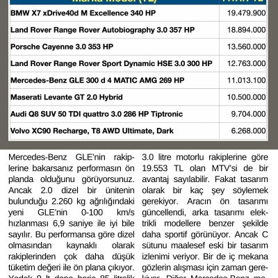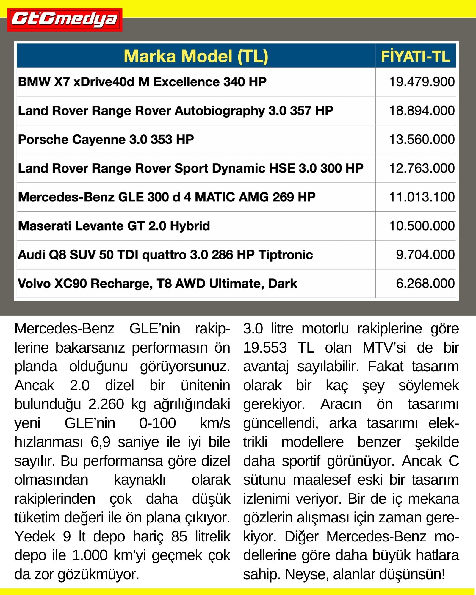 Fakat rakipleri ile kıyaslandığında satılacağı şüphe götürmez. Çünkü Land Rover Range Rover Sport modelinin fiyatı 13.911.000 TL civarına kadar çıkıyor. Porsche Cayenne ise 13.560.000 TL fiyata sahip. BMW X7 fiyatı ise 19.480.000 TL’ye kadar gidiyor. En düşük fiyat olarak Volvo XC90 modeli, 6.268.000 TL ile dikkatleri çekiyor. Yani tüm bu modellerin arasında yeni Mercedes-Benz GLE modelinin taliplileri olcaktır diye düşünüyoruz.