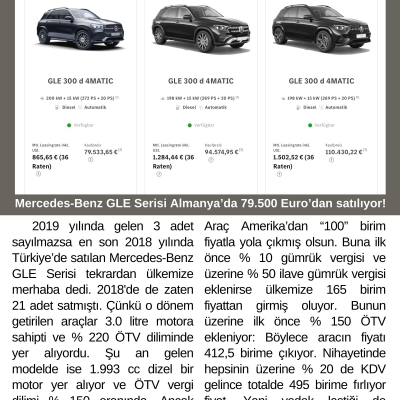 2019 yılında gelen 3 adet sayılmazsa en son 2018 yılında Türkiye’de satılan Mercedes-Benz GLE Serisi tekrardan ülkemize merhaba dedi. 2018'de de zaten 21 adet satmıştı. Çünkü o dönem getirilen araçlar 3.0 litre motora sahipti ve % 220 ÖTV diliminde yer alıyordu. Şu an gelen modelde ise 1.993 cc dizel bir motor yer alıyor ve ÖTV vergi dilimi % 150 oranında. Ancak Amerika’dan Türkiye’ye gelirken fiyatı 5 katına çıkıyor. Nasıl mı?