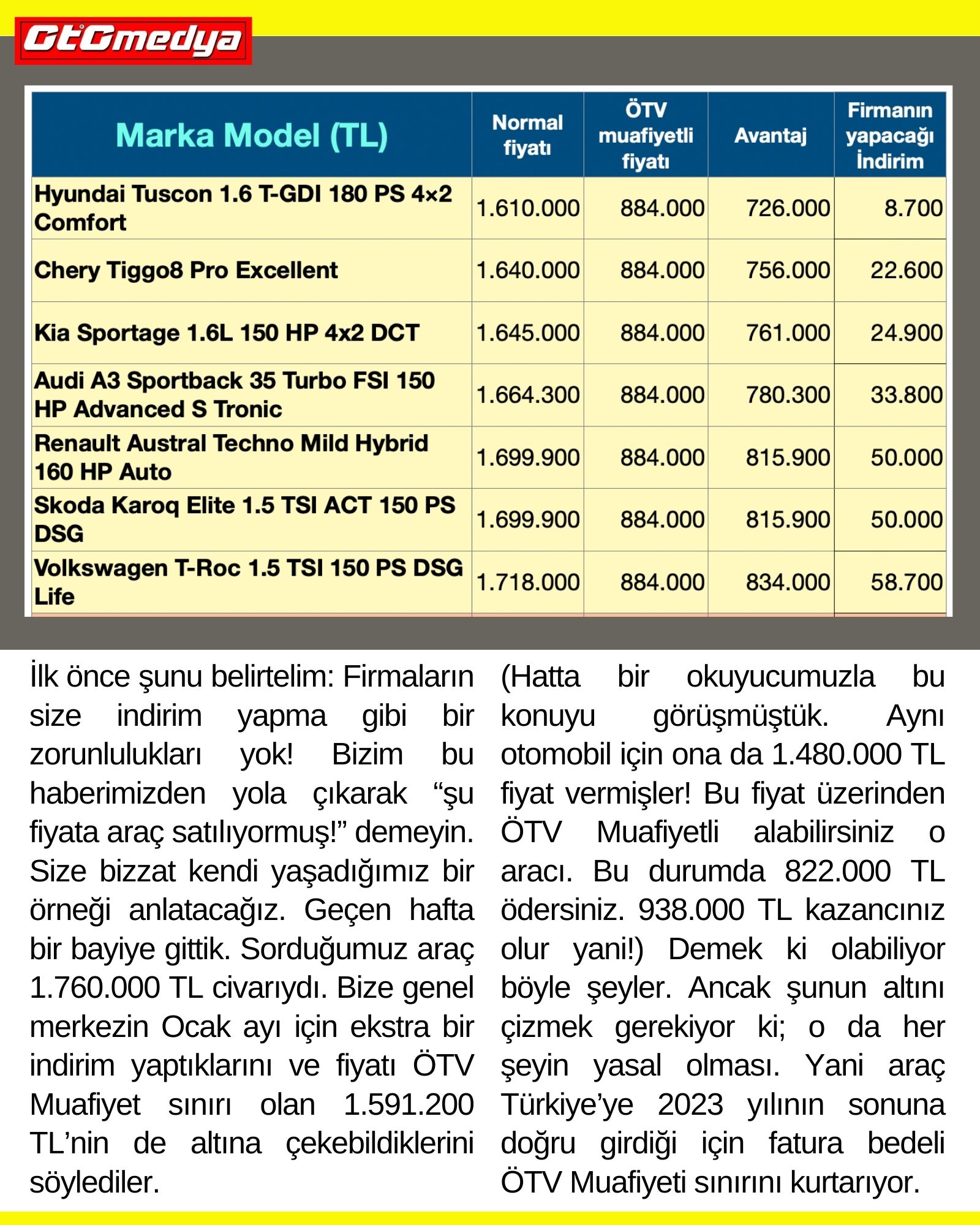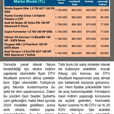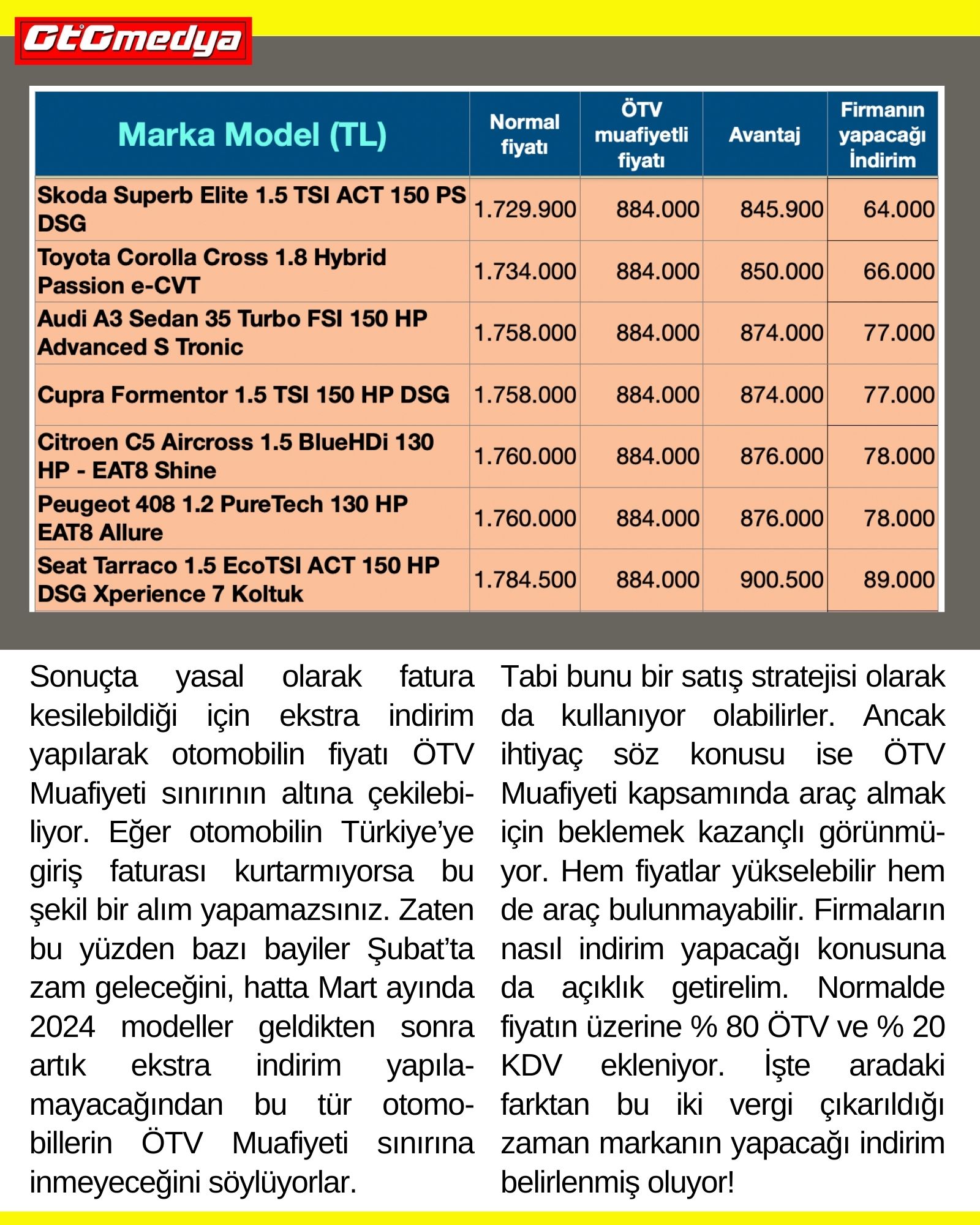 Sonuçta yasal olarak fatura kesilebildiği için ekstra indirim yapılarak otomobilin fiyatı ÖTV Muafiyeti sınırının altına çekilebi-liyor. Eğer otomobilin Türkiye’ye giriş faturası kurtarmıyorsa bu şekil bir alım yapamazsınız. Zaten bu yüzden bazı bayiler Şubat’ta zam geleceğini, hatta Mart ayında 2024 modeller geldikten sonra artık ekstra indirim yapıla-mayacağından bu tür otomo-billerin ÖTV Muafiyeti sınırına inmeyeceğini söylüyorlar.