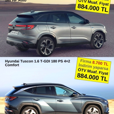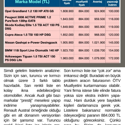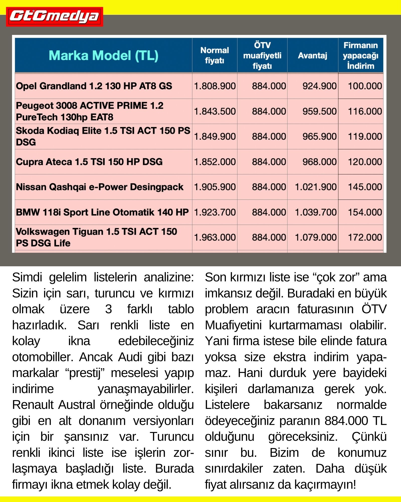 Son kırmızı liste ise “çok zor” ama imkansız değil. Buradaki en büyük problem aracın faturasının ÖTV Muafiyetini kurtarmaması olabilir. Yani firma istese bile elinde fatura yoksa size ekstra indirim yapamaz. Hani durduk yere bayideki kişileri darlamanıza gerek yok. Listelere bakarsanız normalde ödeyeceğiniz paranın 884.000 TL olduğunu göreceksiniz. Çünkü sınır bu. Bizim de konumuz sınırdakiler zaten. Daha düşük fiyat alırsanız da kaçırmayın!