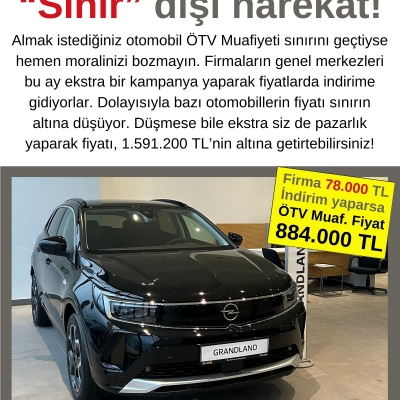 Almak istediğiniz otomobil ÖTV Muafiyeti sınırını geçtiyse hemen moralinizi bozmayın. Firmaların genel merkezleri bu ay ekstra bir kampanya yaparak fiyatlarda indirime gidiyorlar. Dolayısıyla bazı otomobillerin fiyatı sınırın altına düşüyor. Düşmese bile ekstra siz de pazarlık yaparak fiyatı, 1.591.200 TL’nin altına getirtebilirsiniz!