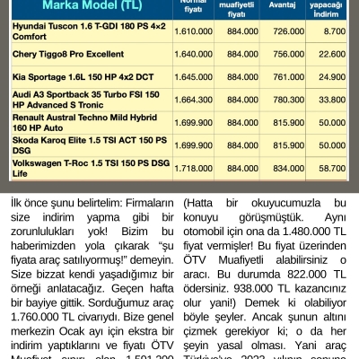 Tabi bunu bir satış stratejisi olarak da kullanıyor olabilirler. Ancak ihtiyaç söz konusu ise ÖTV Muafiyeti kapsamında araç almak için beklemek kazançlı görünmü-yor. Hem fiyatlar yükselebilir hem de araç bulunmayabilir. Firmaların nasıl indirim yapacağı konusuna da açıklık getirelim. Normalde fiyatın üzerine % 80 ÖTV ve % 20 KDV ekleniyor. İşte aradaki farktan bu iki vergi çıkarıldığı zaman markanın yapacağı indirim belirlenmiş oluyor!