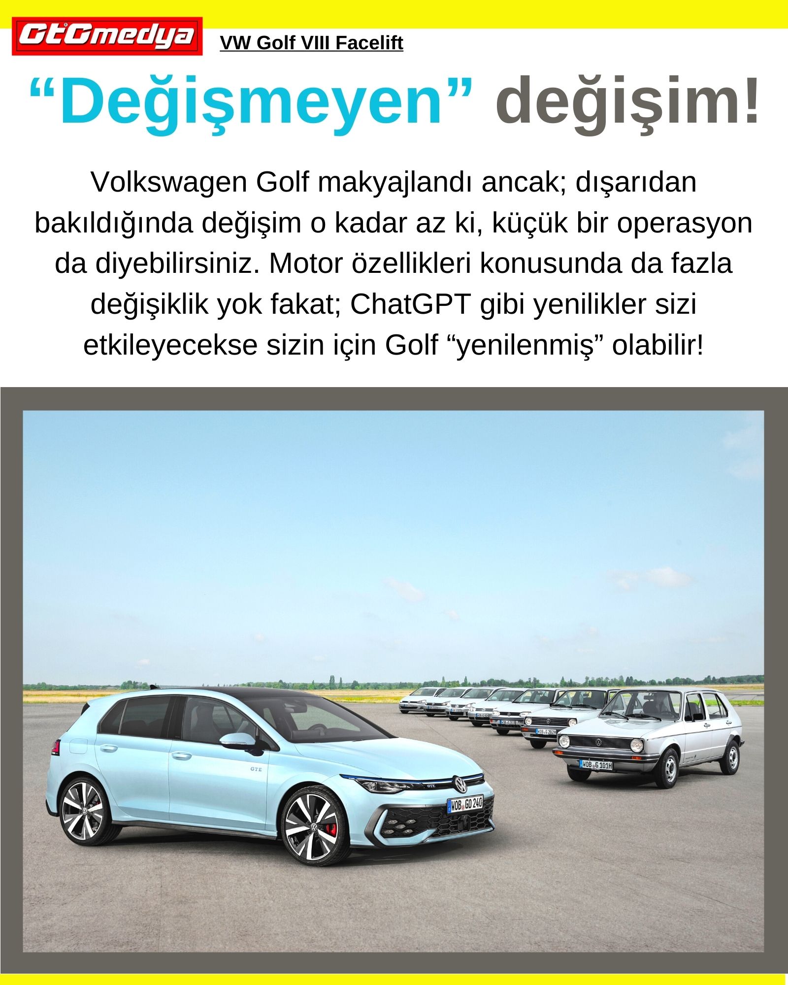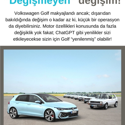 Volkswagen Golf makyajlandı ancak; dışarıdan bakıldığında değişim o kadar az ki, küçük bir operasyon da diyebilirsiniz. Motor özellikleri konusunda da fazla değişiklik yok fakat; ChatGPT gibi yenilikler sizi etkileyecekse sizin için Golf “yenilenmiş” olabilir!