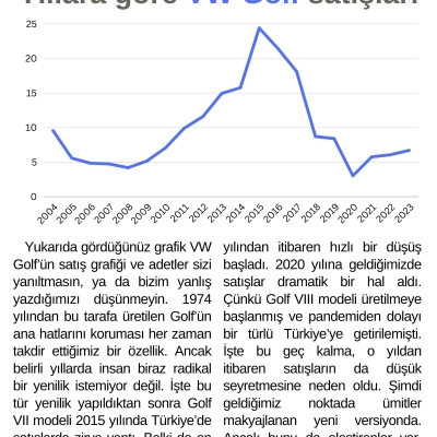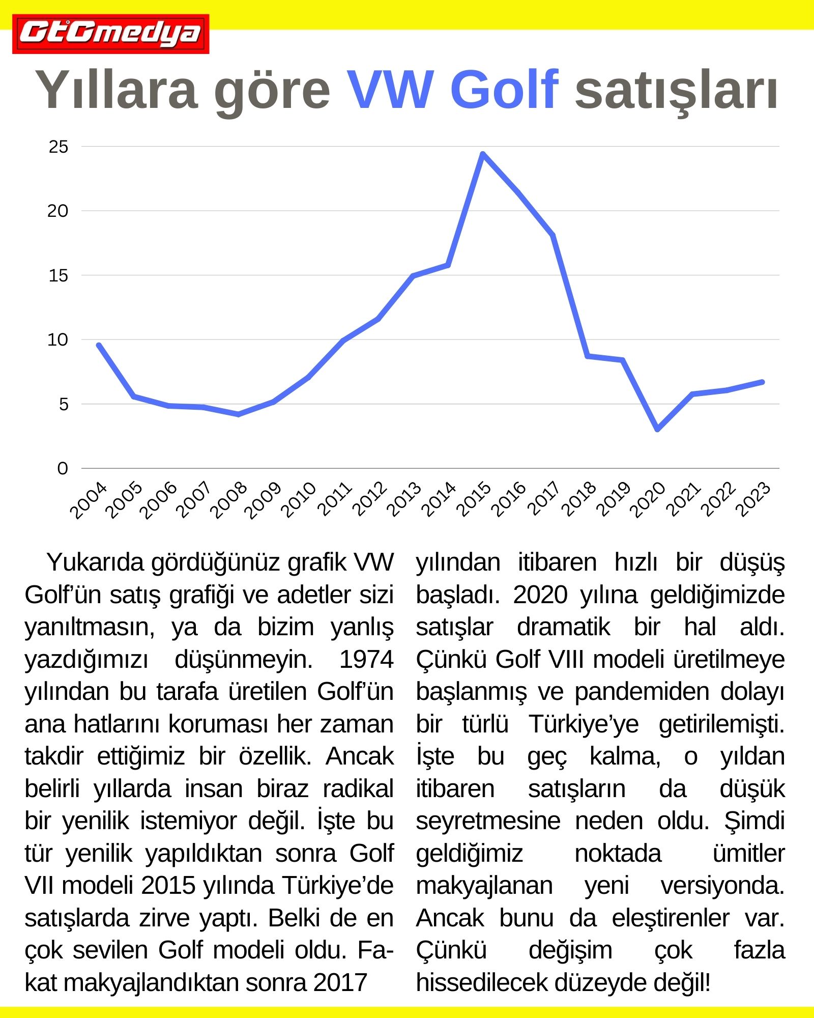 Resimde gördüğünüz grafik VW Golf’ün satış grafiği ve adetler sizi yanıltmasın, ya da bizim yanlış yazdığımızı düşünmeyin. 1974 yılından bu tarafa üretilen Golf’ün ana hatlarını koruması her zaman takdir ettiğimiz bir özellik. Ancak belirli yıllarda insan biraz radikal bir yenilik istemiyor değil. İşte bu tür yenilik yapıldıktan sonra Golf VII modeli 2015 yılında Türkiye’de satışlarda zirve yaptı. Belki de en çok sevilen Golf modeli oldu.