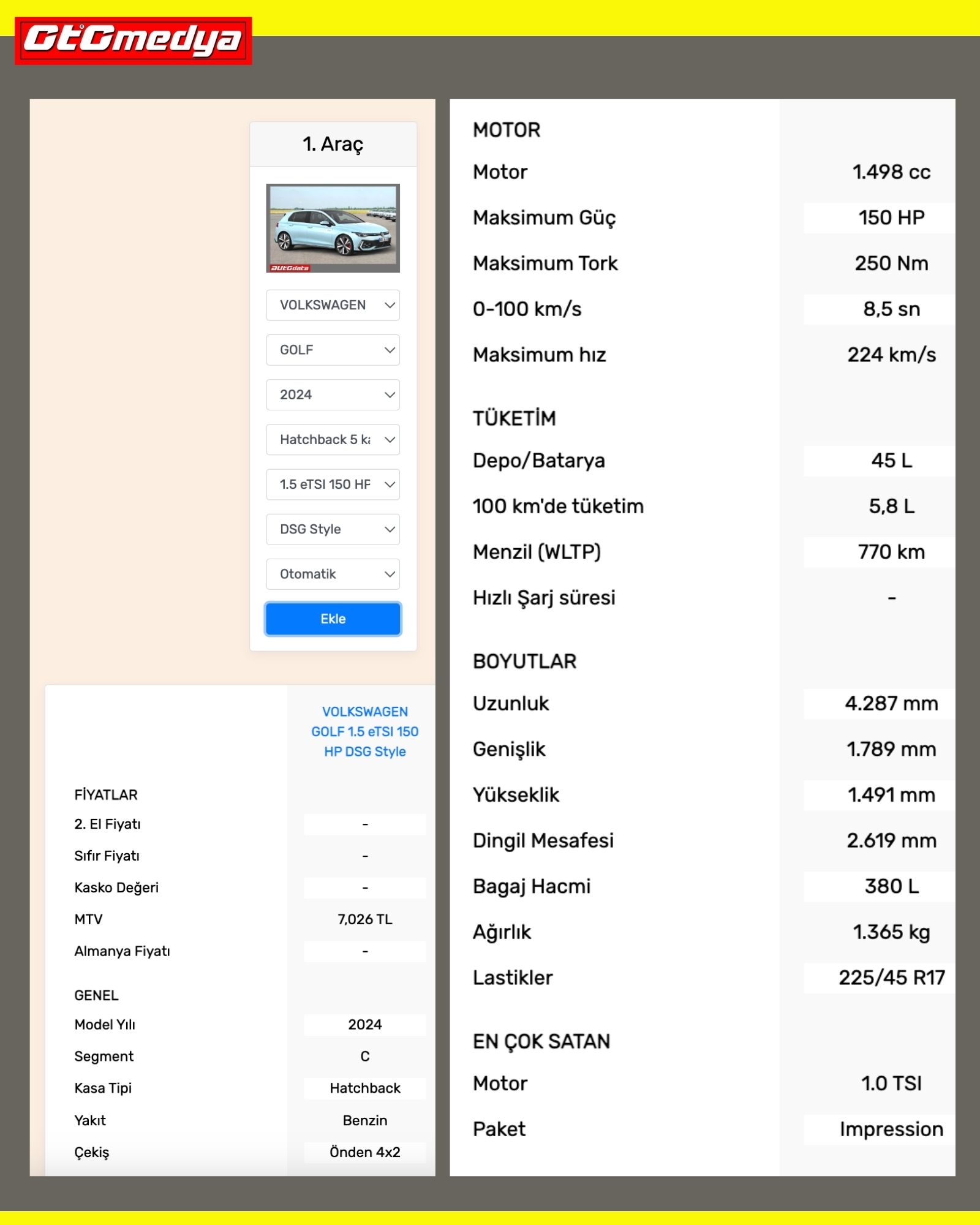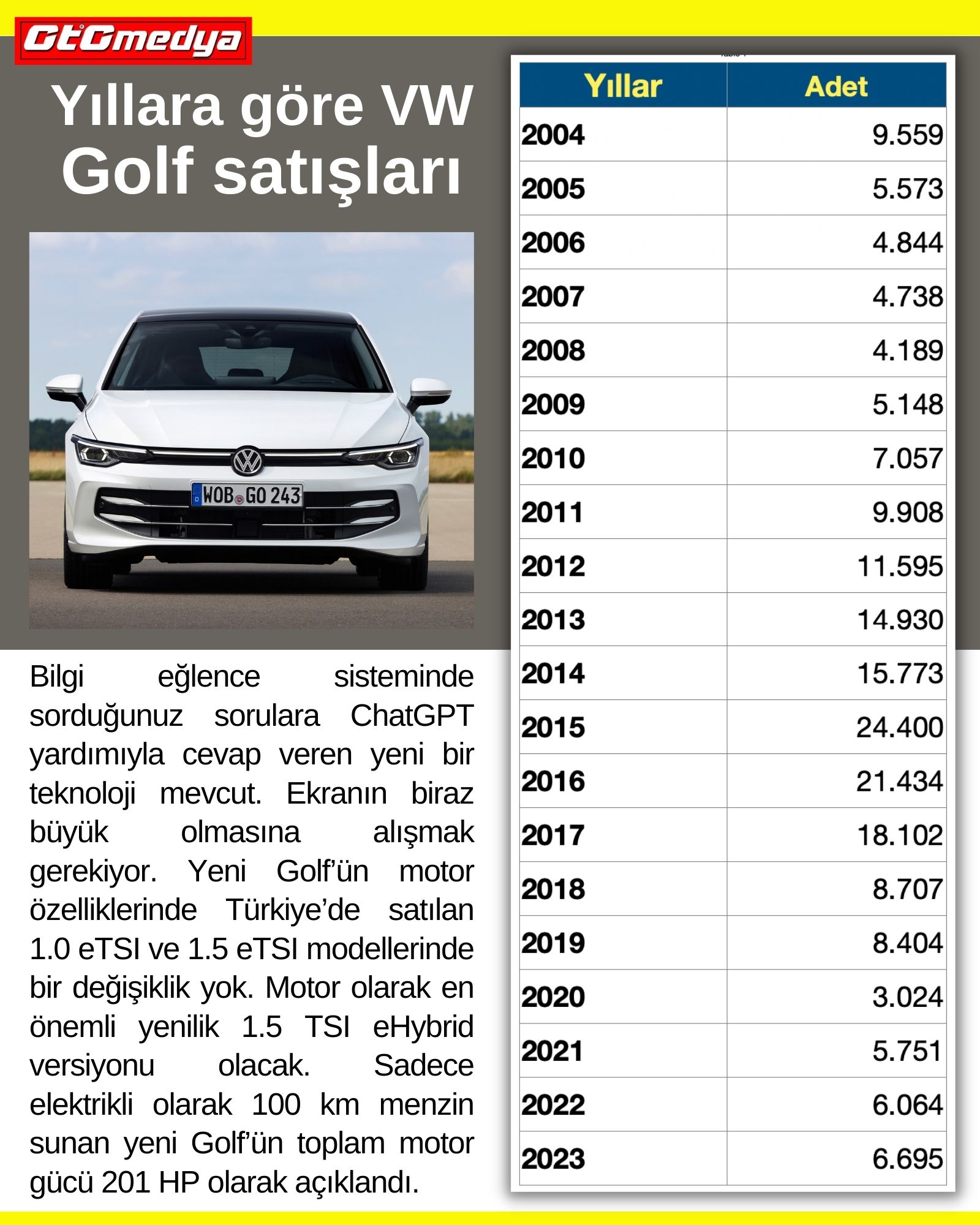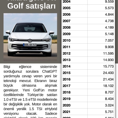 Bilgi eğlence sisteminde sorduğunuz sorulara ChatGPT yardımıyla cevap veren yeni bir teknoloji mevcut. Ekranın biraz büyük olmasına alışmak gerekiyor. Yeni Golf’ün motor özelliklerinde Türkiye’de satılan 1.0 eTSI ve 1.5 eTSI modellerinde bir değişiklik yok. Motor olarak en önemli yenilik 1.5 TSI eHybrid versiyonu olacak. Sadece elektrikli olarak 100 km menzin sunan yeni Golf’ün toplam motor gücü 201 HP olarak açıklandı.