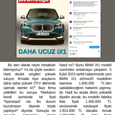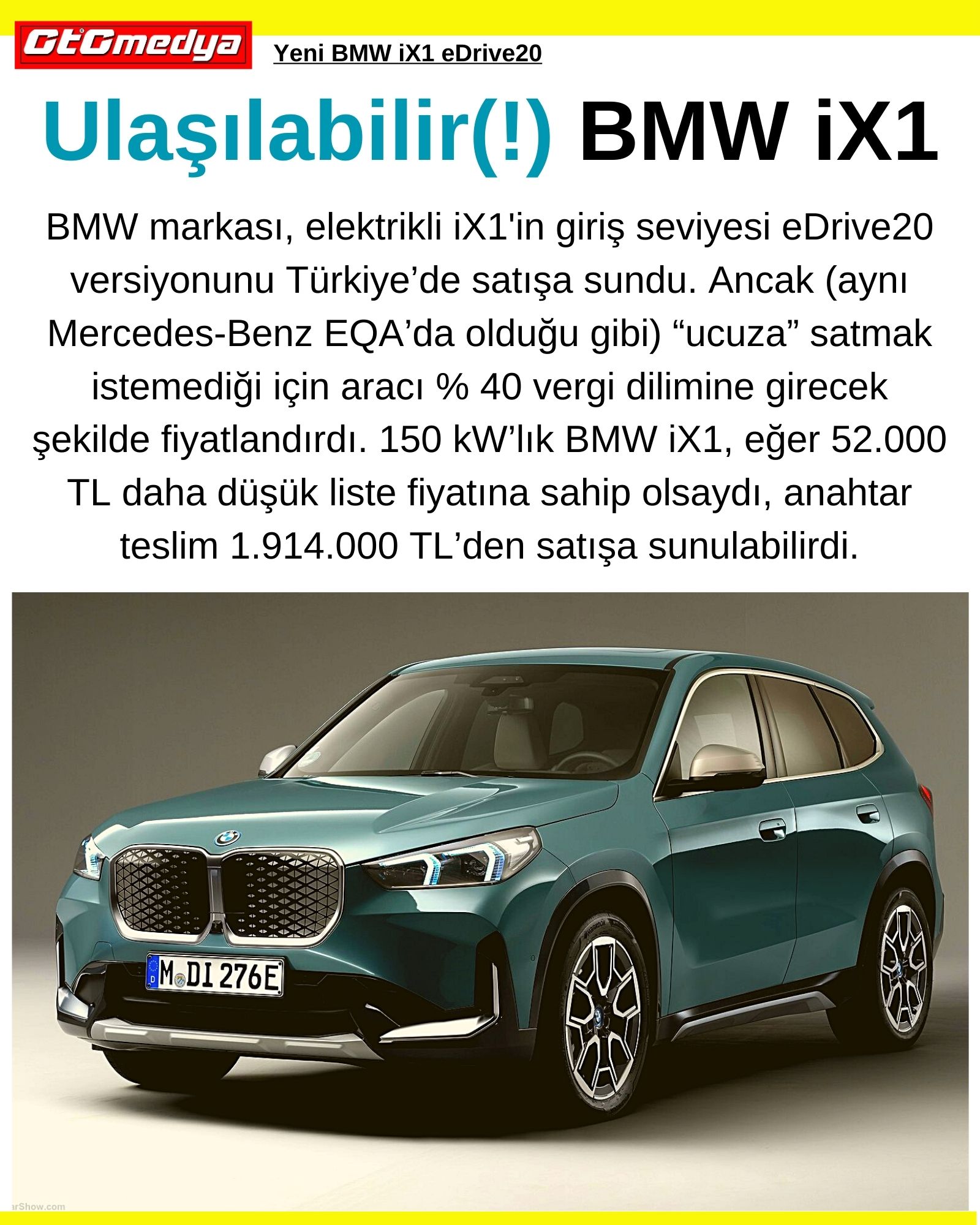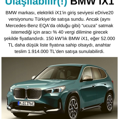 BMW markası, elektrikli iX1'in giriş seviyesi eDrive20 versiyonunu Türkiye’de satışa sundu. Ancak (aynı Mercedes-Benz EQA’da olduğu gibi) “ucuza” satmak istemediği için aracı % 40 vergi dilimine girecek şekilde fiyatlandırdı. 150 kW’lık BMW iX1, eğer 52.000 TL daha düşük liste fiyatına sahip olsaydı, anahtar teslim 1.914.000 TL’den satışa sunulabilirdi.