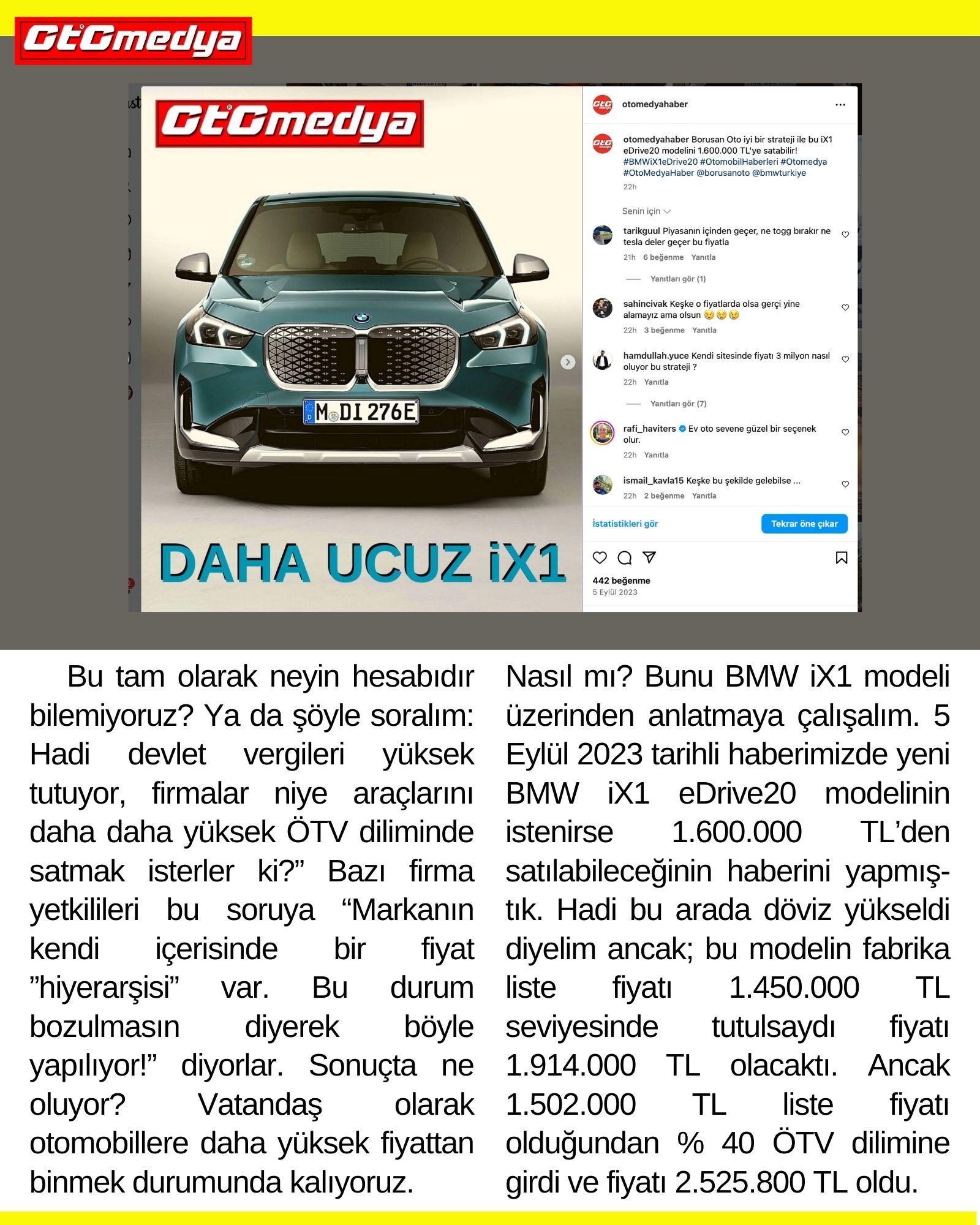 Nasıl mı? Bunu BMW iX1 modeli üzerinden anlatmaya çalışalım. 5 Eylül 2023 tarihli haberimizde yeni BMW iX1 eDrive20 modelinin istenirse 1.600.000 TL’den satılabileceğinin haberini yapmıştık. Hadi bu arada döviz yükseldi diyelim ancak; bu modelin fabrika liste fiyatı 1.450.000 TL seviyesinde tutulsaydı fiyatı 1.914.000 TL olacaktı. Ancak 1.502.000 TL liste fiyatı olduğundan % 40 ÖTV dilimine girdi ve fiyatı 2.525.800 TL oldu.