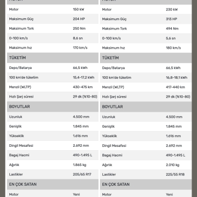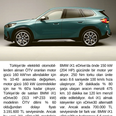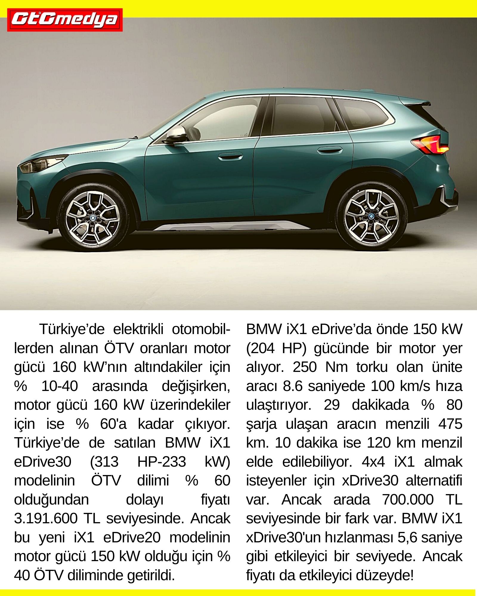 Türkiye’de elektrikli otomobil-lerden alınan ÖTV oranları motor gücü 160 kW’nın altındakiler için % 10-40 arasında değişirken, motor gücü 160 kW üzerindekiler için ise % 60'a kadar çıkıyor. Türkiye’de de satılan BMW iX1 eDrive30 (313 HP-233 kW) modelinin ÖTV dilimi % 60 olduğundan dolayı fiyatı 3.191.600 TL seviyesinde. Ancak bu yeni iX1 eDrive20 modelinin motor gücü 150 kW olduğu için % 40 ÖTV diliminde getirildi.