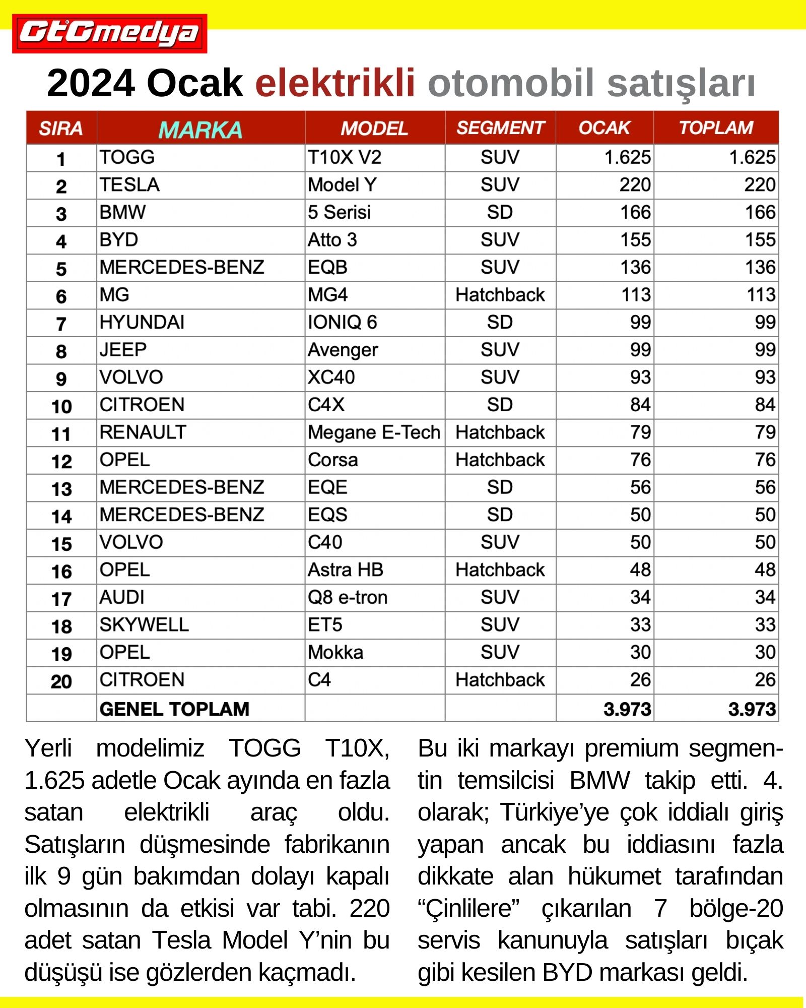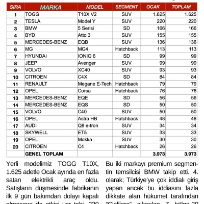 Yerli modelimiz TOGG T10X,  1.625 adetle Ocak ayında en fazla satan elektrikli araç oldu. Satışların düşmesinde fabrikanın ilk 9 gün bakımdan dolayı kapalı olmasının da etkisi var tabi. 220 adet satan Tesla Model Y’nin bu düşüşü ise gözlerden kaçmadı. Bu iki markayı premium segmentin temsilcisi BMW takip etti. 4. olarak; Türkiye’ye çok iddialı giriş yapan ancak bu iddiasını fazla dikkate alan hükumet tarafından “Çinlilere” çıkarılan 7 bölge-20 servis kanunuyla satışları bıçak gibi kesilen BYD markası geldi.