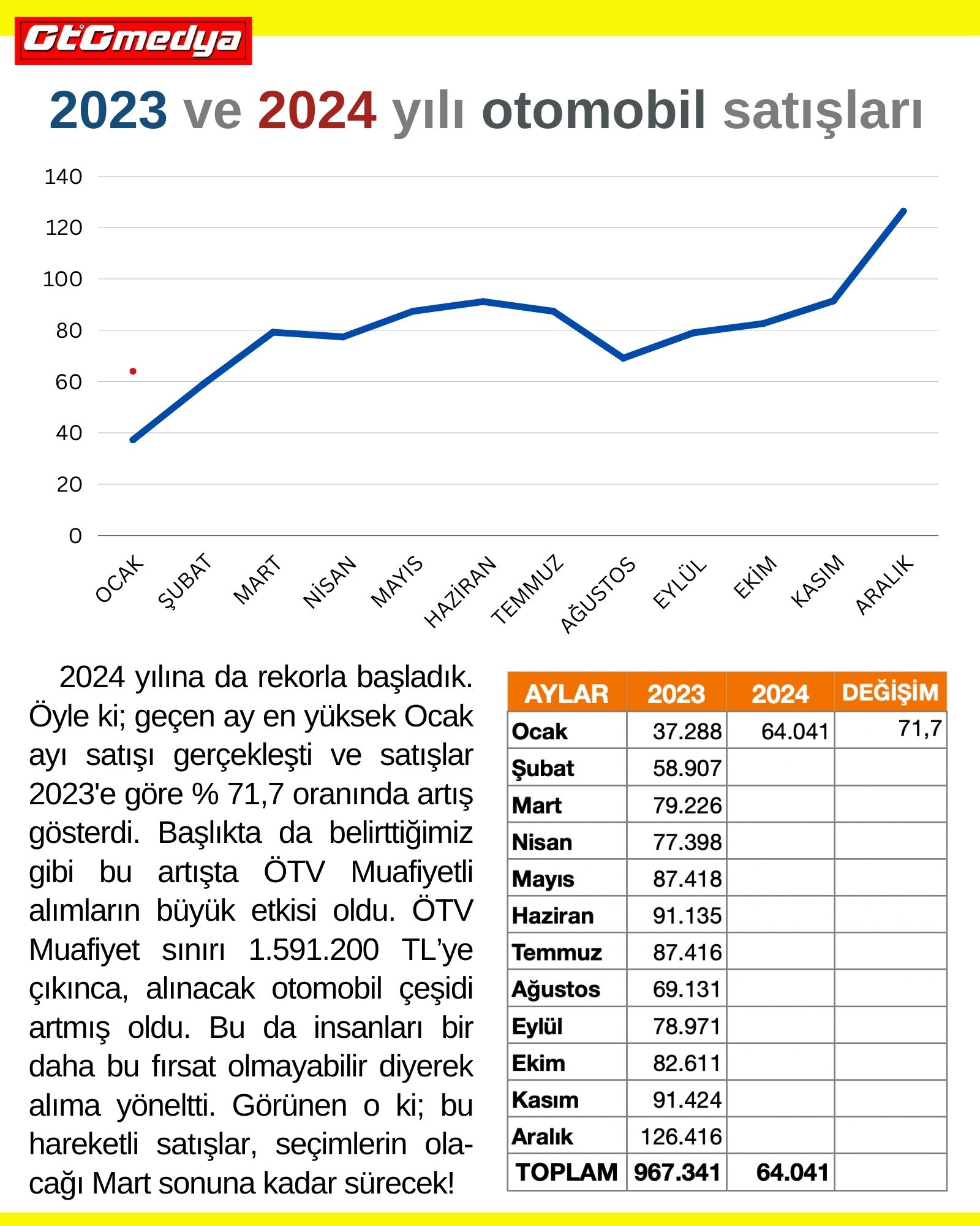 2024 yılına da rekorla başladık. Öyle ki; geçen ay en yüksek Ocak ayı satışı gerçekleşti ve satışlar 2023'e göre % 71,7 oranında artış gösterdi. Başlıkta da belirttiğimiz gibi bu artışta ÖTV Muafiyetli alımların büyük etkisi oldu. ÖTV Muafiyet sınırı 1.591.200 TL’ye çıkınca, alınacak otomobil çeşidi artmış oldu. Bu da insanları bir daha bu fırsat olmayabilir diyerek alıma yöneltti. Görünen o ki; bu hareketli satışlar, seçimlerin ola-cağı Mart sonuna kadar sürecek!