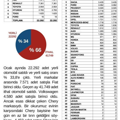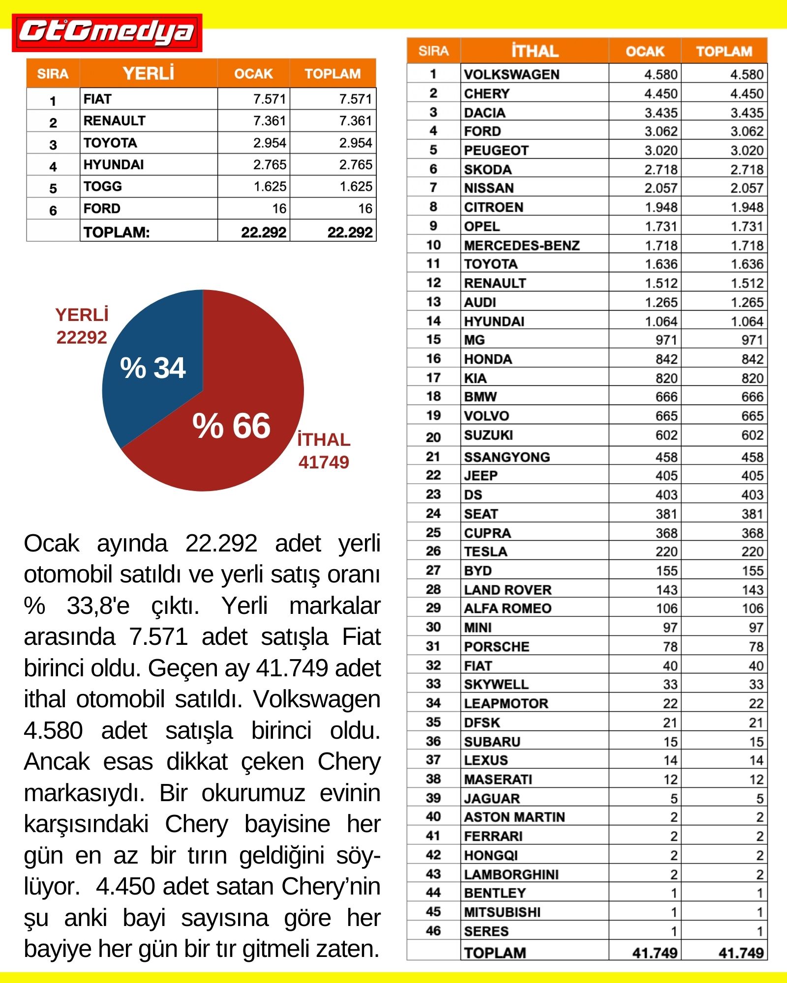 Ocak ayında 22.292 adet yerli otomobil satıldı ve yerli satış oranı % 33,8'e çıktı. Yerli markalar arasında 7.571 adet satışla Fiat birinci oldu. Geçen ay 41.749 adet ithal otomobil satıldı. Volkswagen 4.580 adet satışla birinci oldu. Ancak esas dikkat çeken Chery markasıydı. Bir okurumuz evinin karşısındaki Chery bayisine her gün en az bir tırın geldiğini söylüyor.  4.450 adet satan Chery’nin şu anki bayi sayısına göre her bayiye her gün bir tır gitmeli zaten.