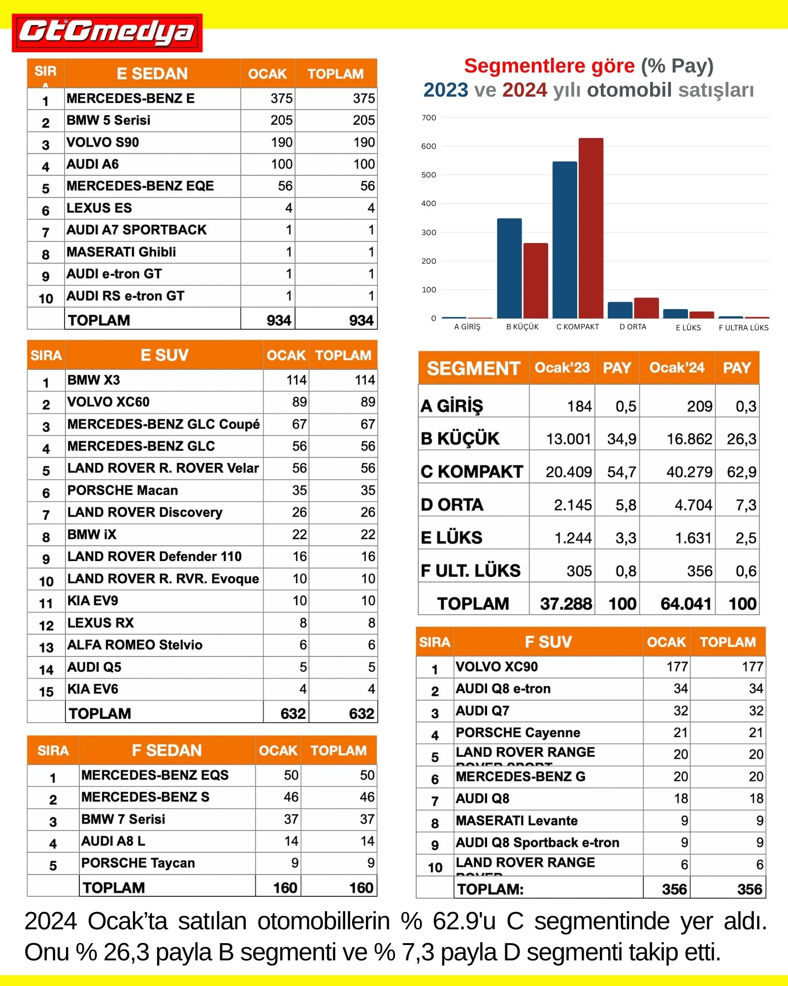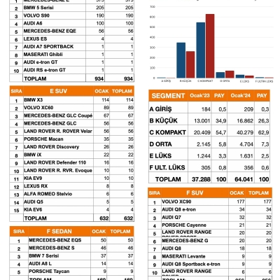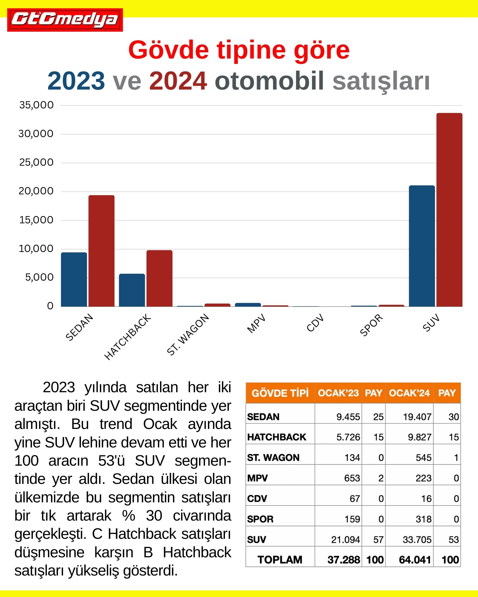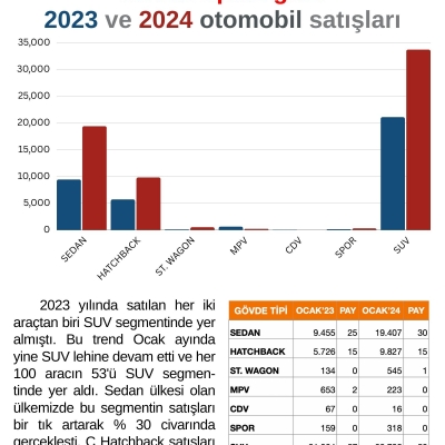 2023 yılında satılan her iki araçtan biri SUV segmentinde yer almıştı. Bu trend Ocak ayında yine SUV lehine devam etti ve her 100 aracın 53'ü SUV segmen-tinde yer aldı. Sedan ülkesi olan ülkemizde bu segmentin satışları bir tık artarak % 30 civarında gerçekleşti. C Hatchback satışları düşmesine karşın B Hatchback satışları yükseliş gösterdi.