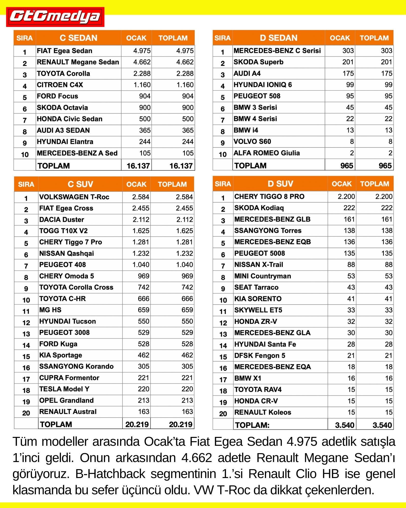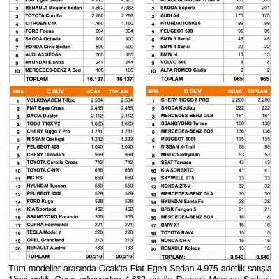 Tüm modeller arasında Ocak’ta Fiat Egea Sedan 4.975 adetlik satışla 1’inci geldi. Onun arkasından 4.662 adetle Renault Megane Sedan’ı görüyoruz. B-Hatchback segmentinin 1.’si Renault Clio HB ise genel klasmanda bu sefer üçüncü oldu. VW T-Roc da dikkat çekenlerden. 2024 Ocak’ta satılan otomobillerin % 62.9'u C segmentinde yer aldı. Onu % 26,3 payla B segmenti ve % 7,3 payla D segmenti takip etti.