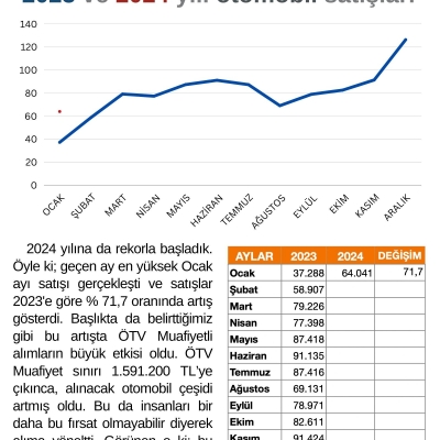 Rekorla kapattığımız 2023 yılından sonra hiç gaz kesmeden 2024 yılına başlamış olduk. Tabi bunda ÖTV muafiyetli alımların etkisi büyük oldu. Yılın ilk ayında 22.292 adet yerli, 41.749 adedi ise ithal olmak üzere toplam 64.041 adet otomobil satıldı. Yerli model  satış oranı % 33,8 seviyesinde gerçekleşti.