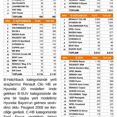 B-Hatchback kategorisinde yerli araçlarımız Renault Clio HB ve Hyundai i20 modelleri önde gelirken B-SUV kategorisinde de yine bir başka yerli modelimiz Hyundai Bayon’un gelmesi sevindirici oldu. Peugeot 2008 ise ikinciliğe geriledi. C-HB kategorisinde Ford Focus modelinin birinci olması dikkatleri üzerine çekti. VW Golf ise az farkla ikinci oldu.
