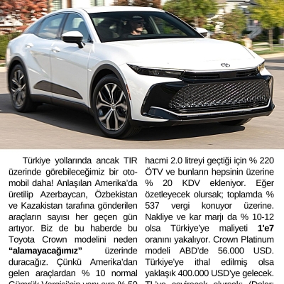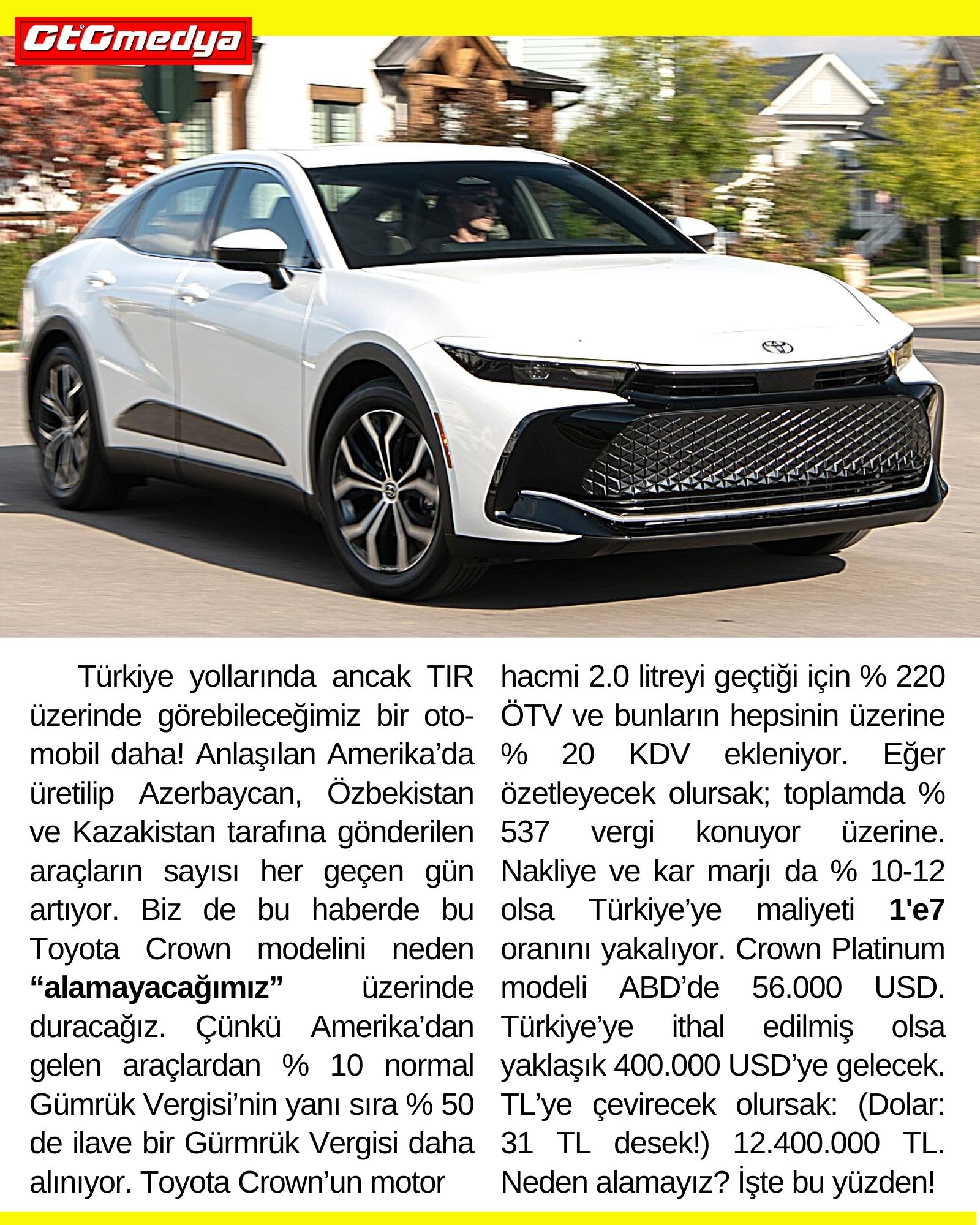 Toyota Crown’un motor hacmi 2.0 litreyi geçtiği için % 220 ÖTV ve bunların hepsinin üzerine % 20 KDV ekleniyor. Eğer özetleyecek olursak; toplamda % 537 vergi konuyor üzerine. Nakliye ve kar marjı da % 10-12 olsa Türkiye’ye maliyeti 1'e7 oranını yakalıyor. Crown Platinum modeli ABD’de 56.000 USD. Türkiye’ye ithal edilmiş olsa yaklaşık 400.000 USD’ye gelecek. TL’ye çevirecek olursak: (Dolar: 31 TL desek!) 12.400.000 TL. Neden alamayız? İşte bu yüzden!