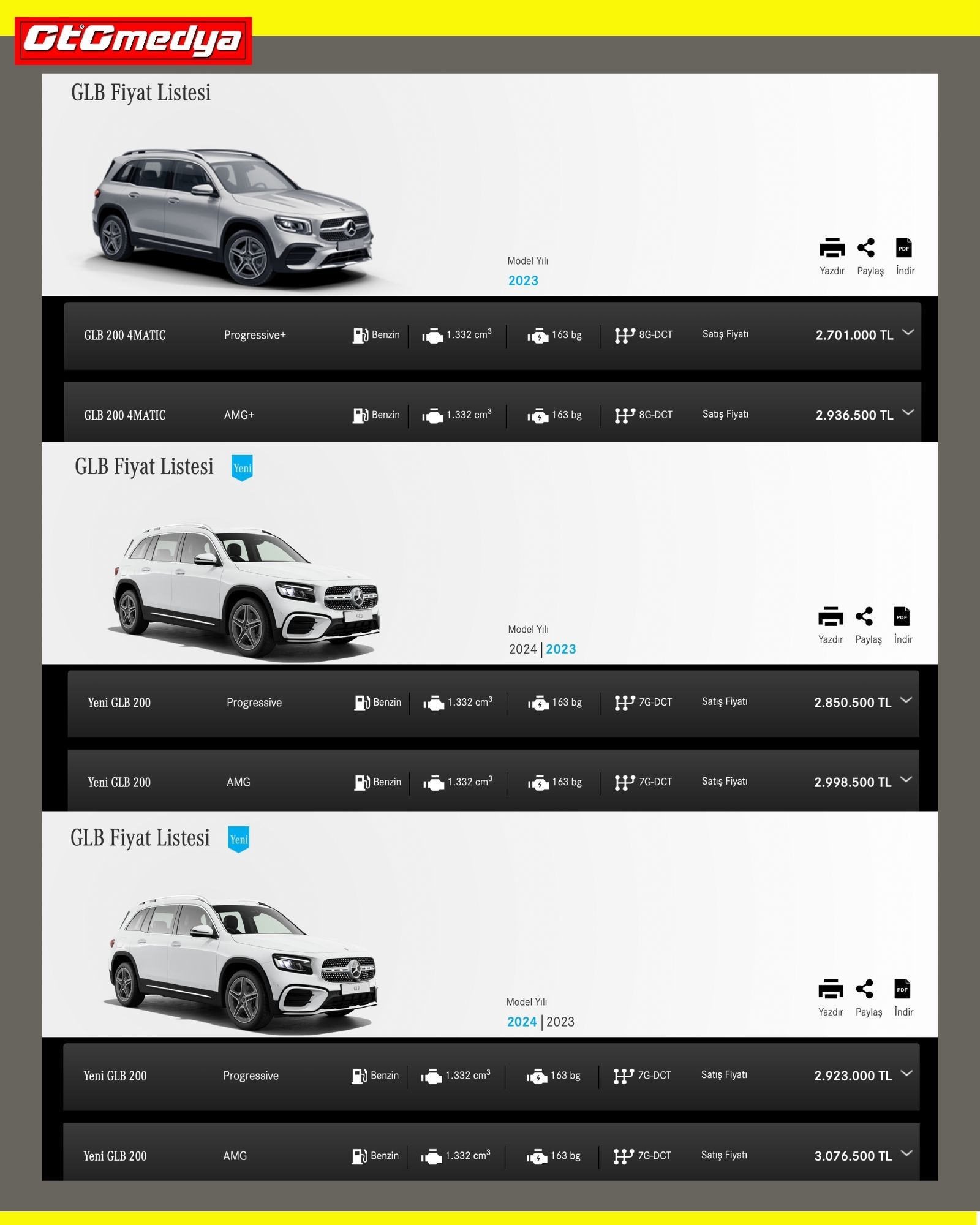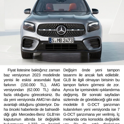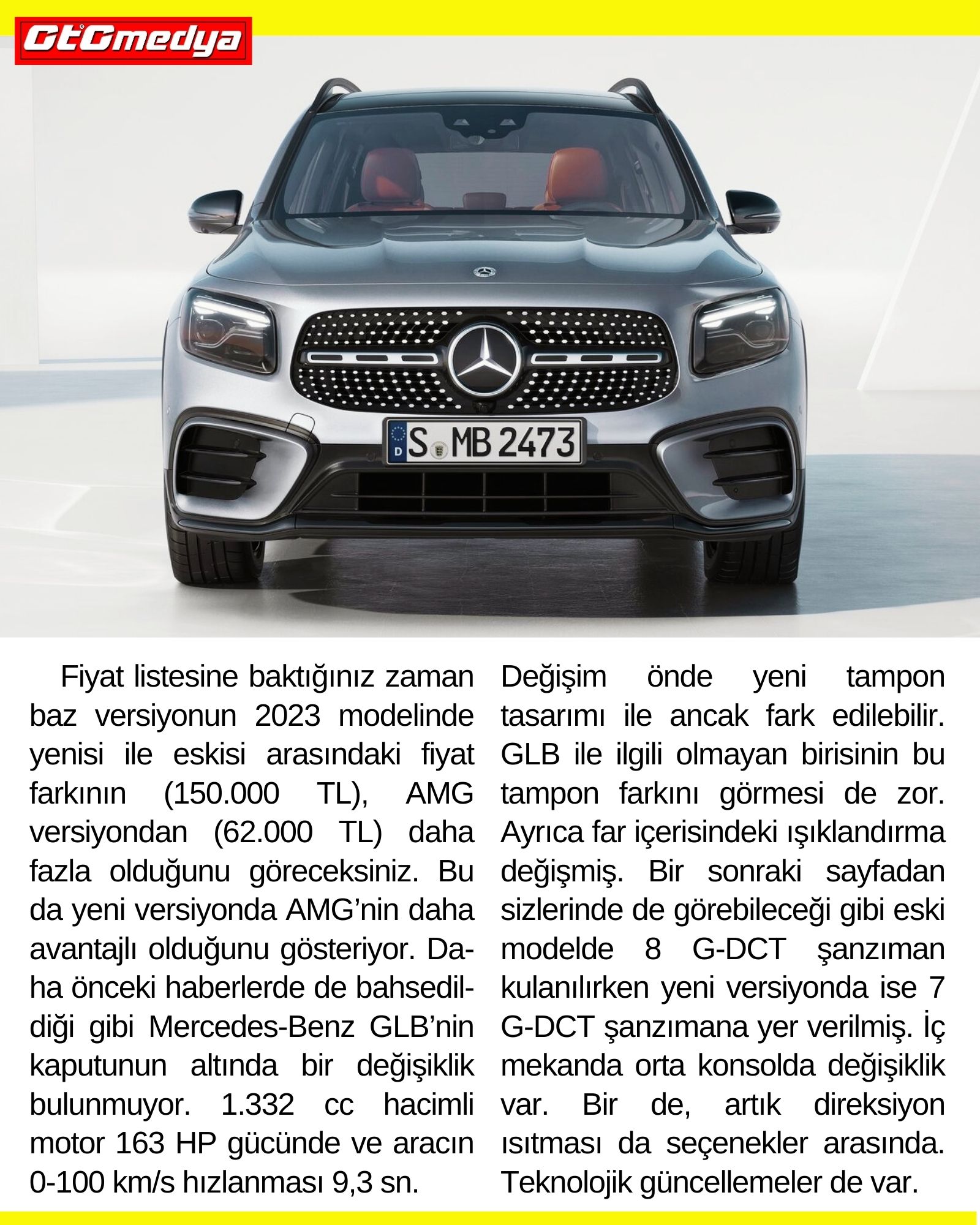 Fiyat listesine baktığınız zaman baz versiyonun 2023 modelinde yenisi ile eskisi arasındaki fiyat farkının (150.000 TL), AMG versiyondan (62.000 TL) daha fazla olduğunu göreceksiniz. Bu da yeni versiyonda AMG’nin daha avantajlı olduğunu gösteriyor. Da-ha önceki haberlerde de bahsedil-diği gibi Mercedes-Benz GLB’nin kaputunun altında bir değişiklik bulunmuyor. 1.332 cc hacimli motor 163 HP gücünde ve aracın 0-100 km/s hızlanması 9,3 sn.