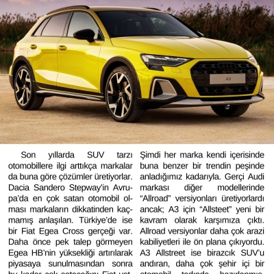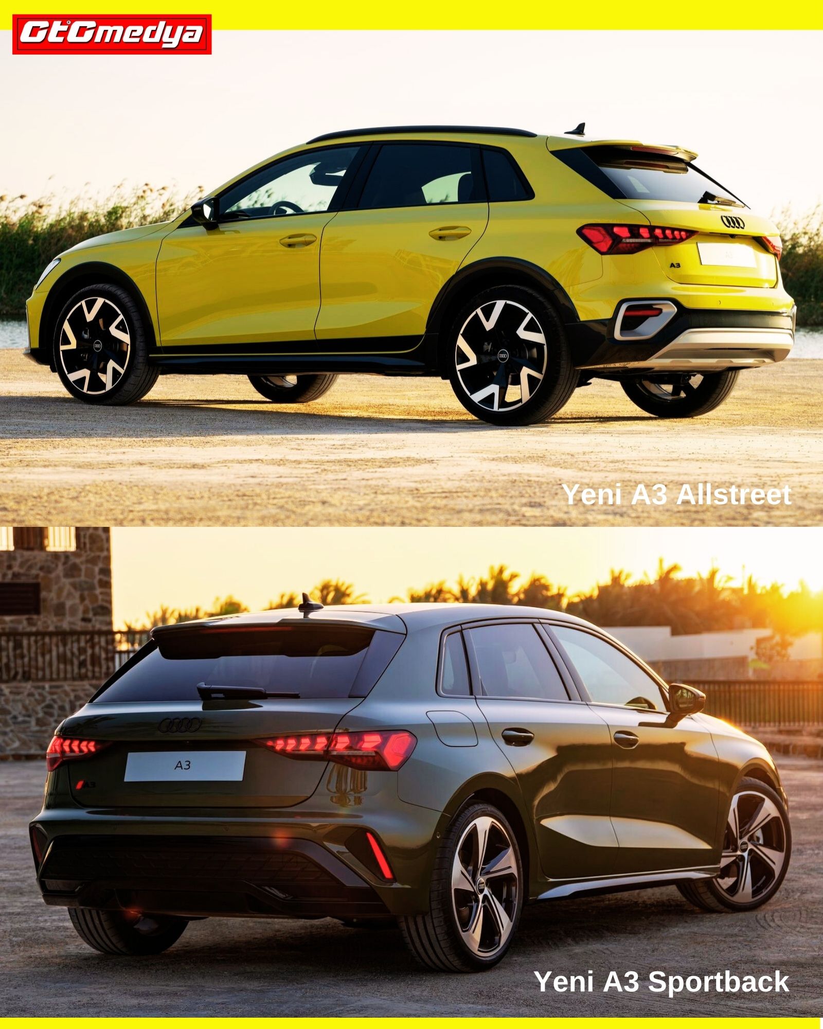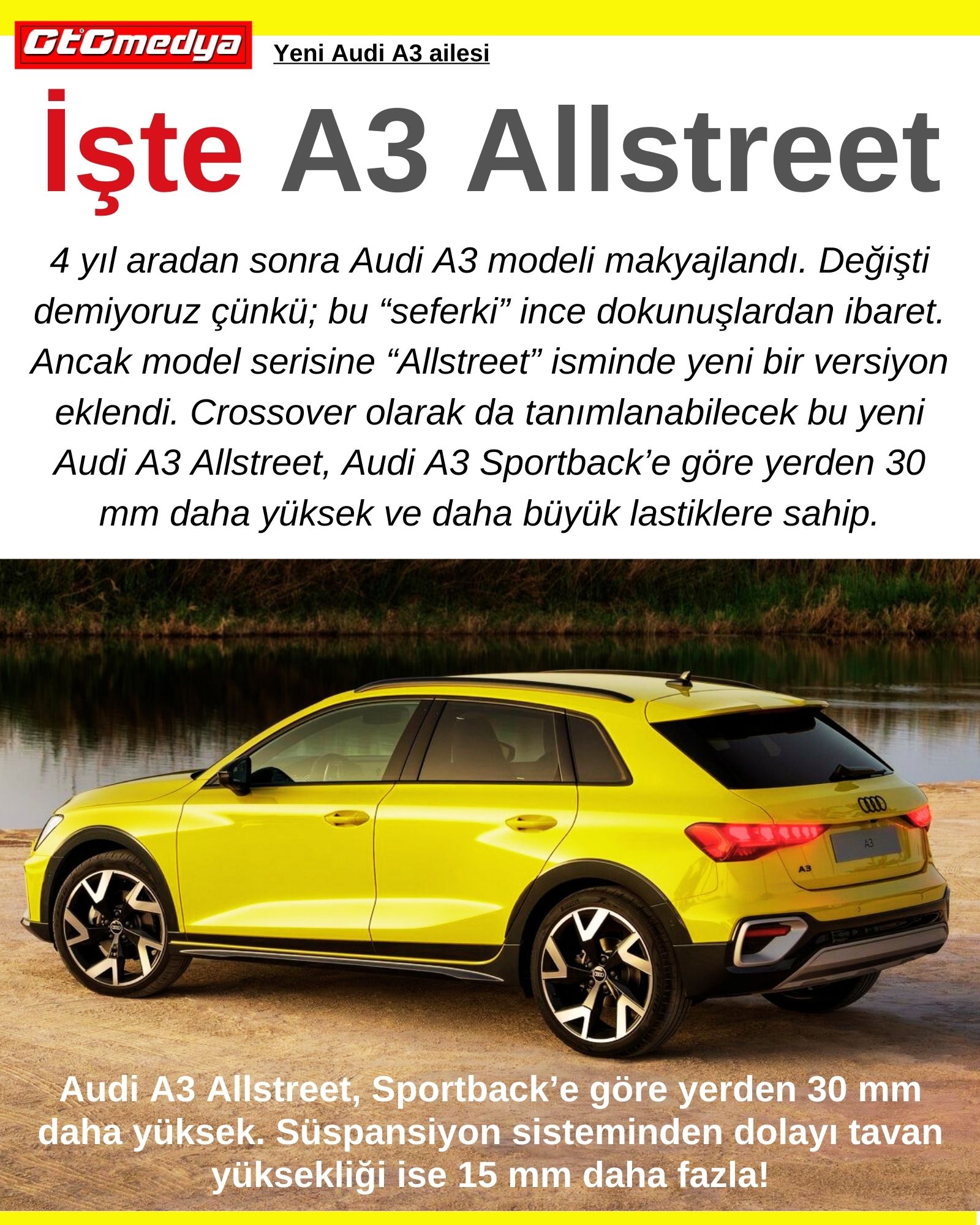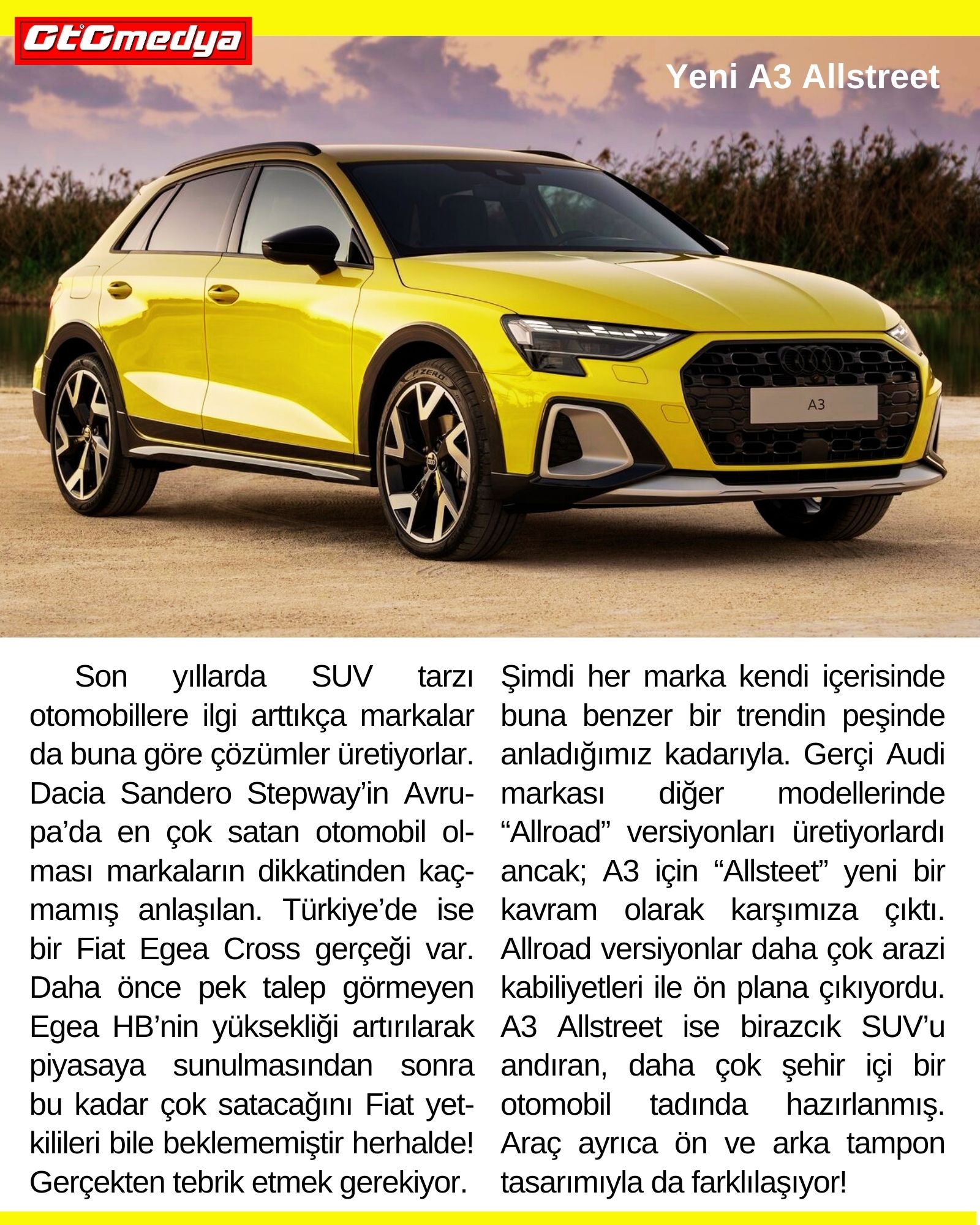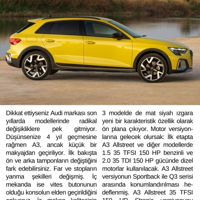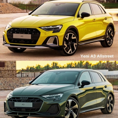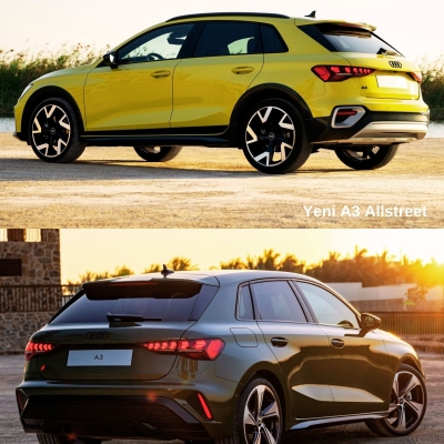 Şimdi her marka kendi içerisinde buna benzer bir trendin peşinde anladığımız kadarıyla. Gerçi Audi markası diğer modellerinde “Allroad” versiyonları üretiyorlardı ancak; A3 için “Allsteet” yeni bir kavram olarak karşımıza çıktı. Allroad versiyonlar daha çok arazi kabiliyetleri ile ön plana çıkıyordu. A3 Allstreet ise birazcık SUV’u andıran, daha çok şehir içi bir otomobil tadında hazırlanmış. Araç ayrıca ön ve arka tampon tasarımıyla da farklılaşıyor!