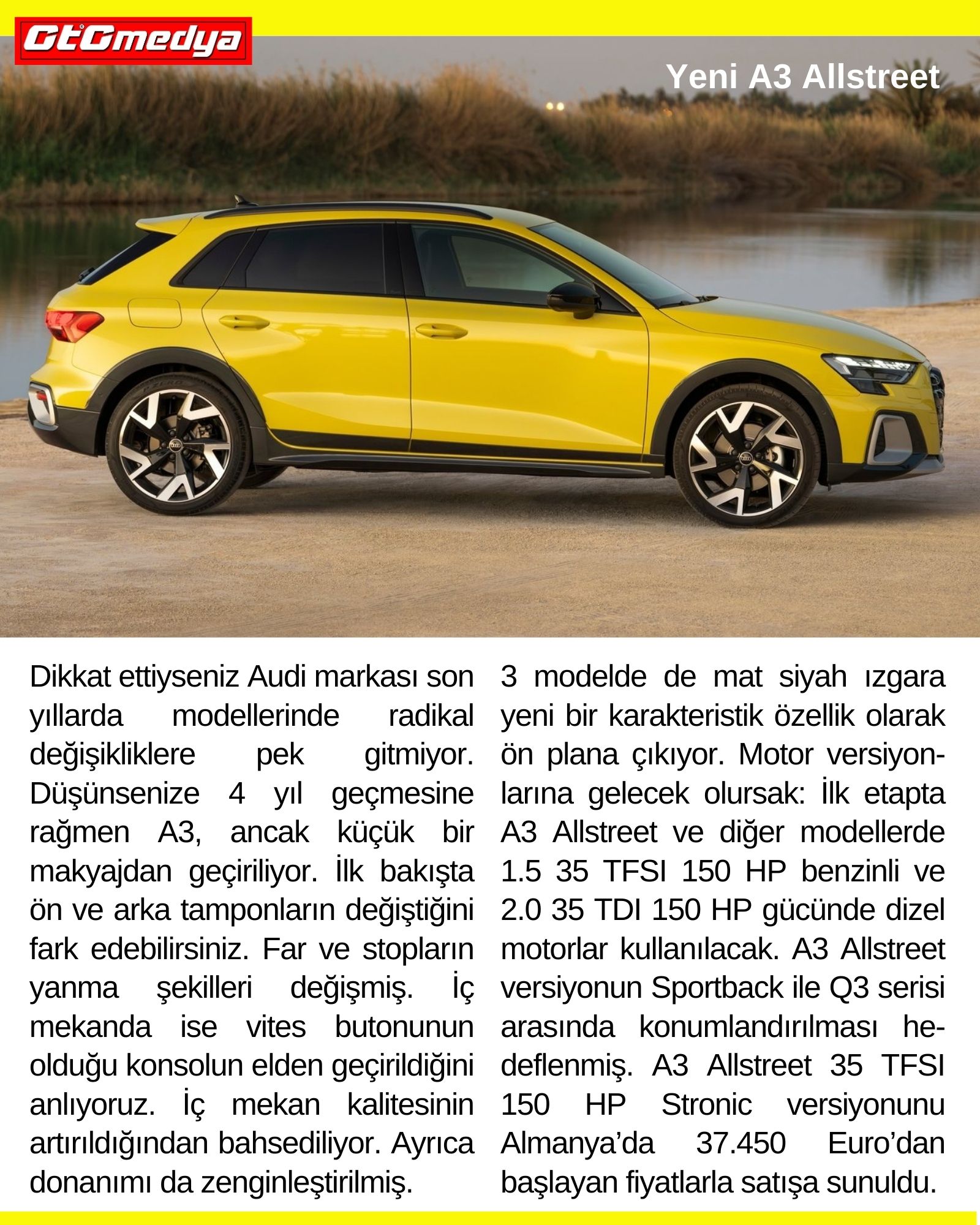 3 modelde de mat siyah ızgara yeni bir karakteristik özellik olarak ön plana çıkıyor. Motor versiyonlarına gelecek olursak: İlk etapta A3 Allstreet ve diğer modellerde 1.5 35 TFSI 150 HP benzinli ve 2.0 35 TDI 150 HP gücünde dizel motorlar kullanılacak. A3 Allstreet versiyonun Sportback ile Q3 serisi arasında konumlandırılması hedeflenmiş. A3 Allstreet 35 TFSI 150 HP Stronic versiyonunu  Almanya’da 37.450 Euro’dan başlayan fiyatlarla satışa sunuldu.