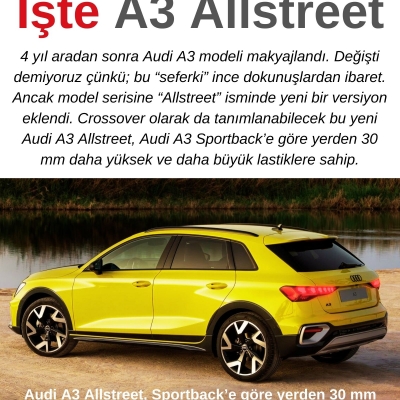 4 yıl aradan sonra Audi A3 modeli makyajlandı. Değişti demiyoruz çünkü; bu “seferki” ince dokunuşlardan ibaret. Ancak model serisine “Allstreet” isminde yeni bir versiyon eklendi. Crossover olarak da tanımlanabilecek bu yeni Audi A3 Allstreet, Audi A3 Sportback’e göre yerden 30 mm daha yüksek ve daha büyük lastiklere sahip.