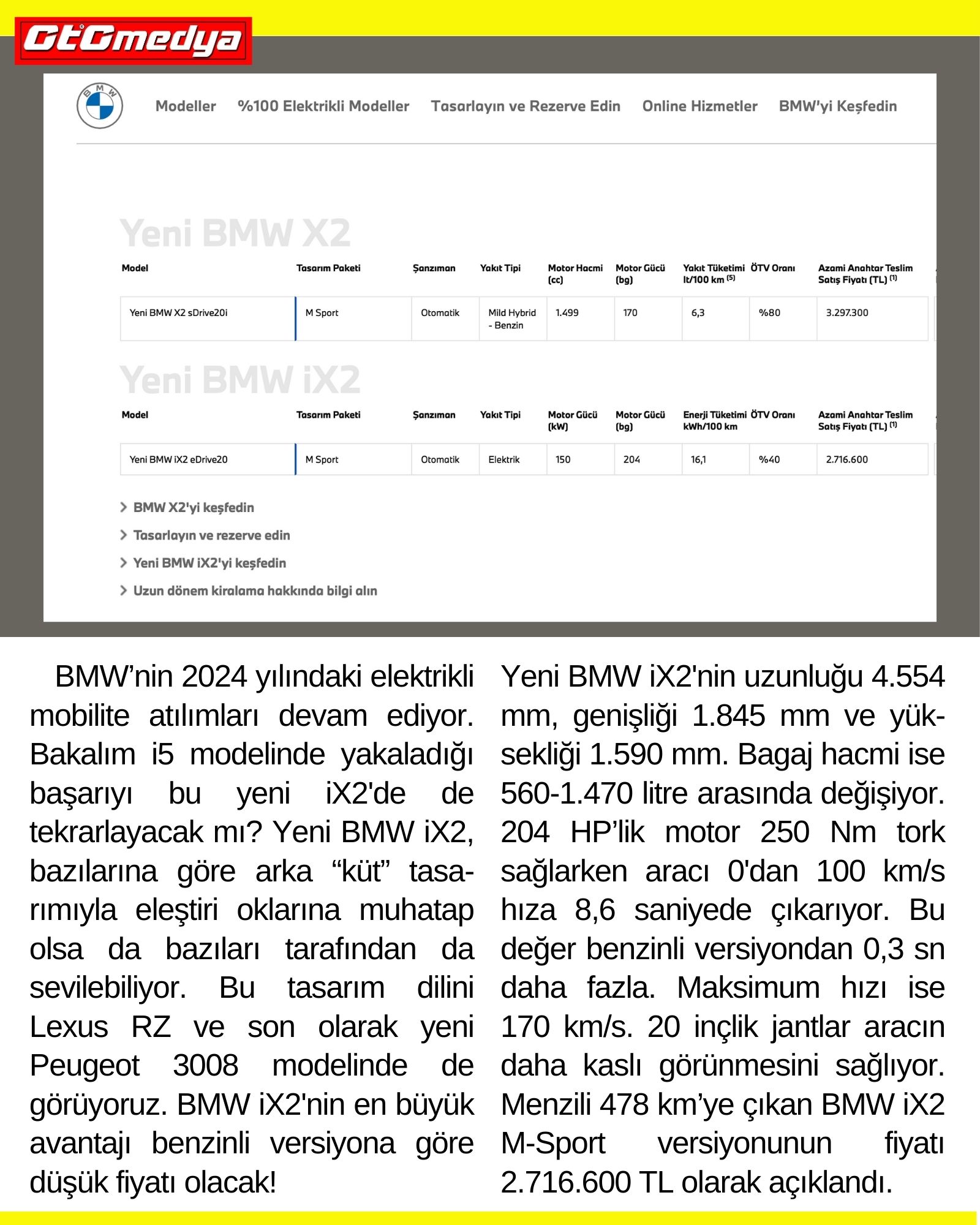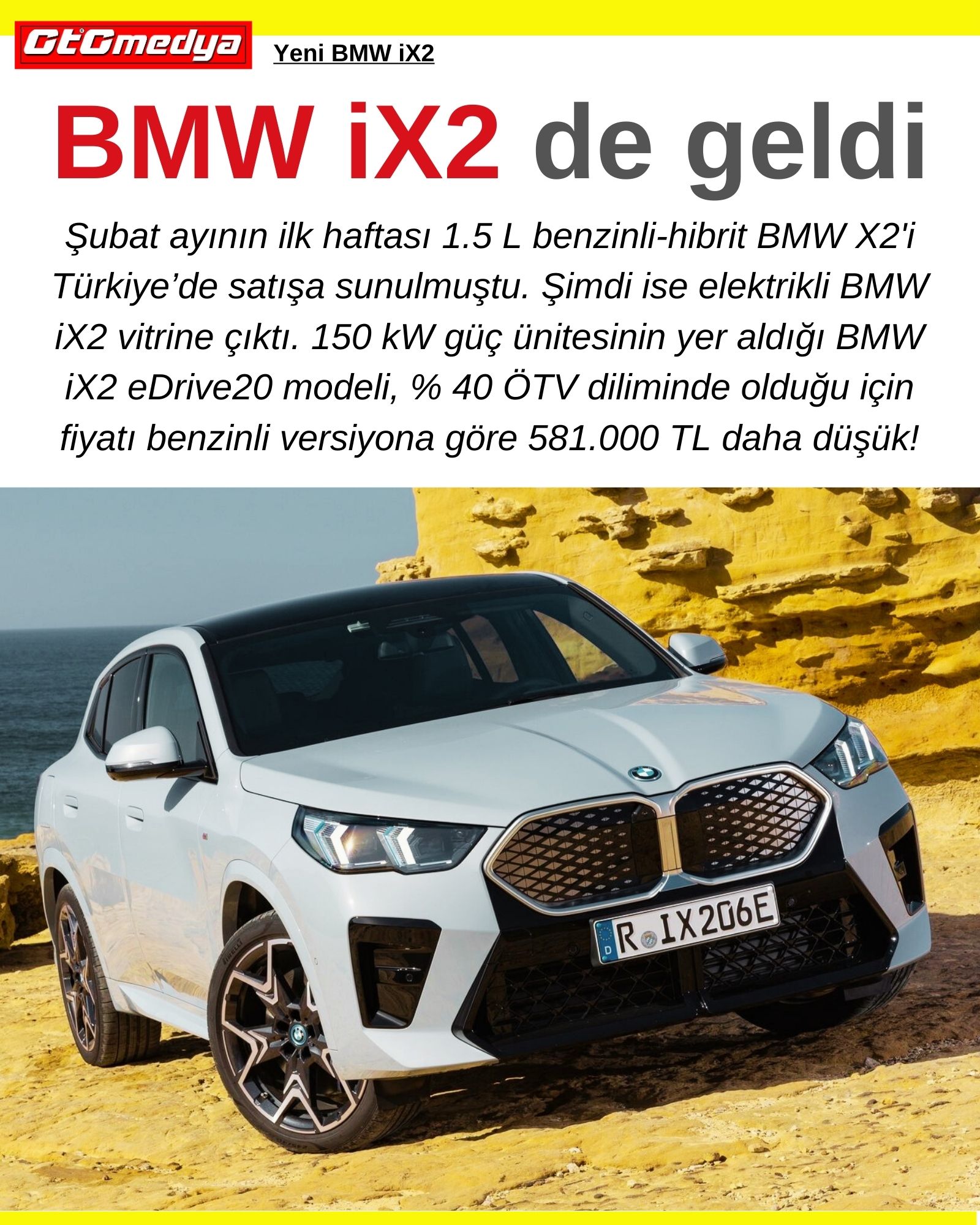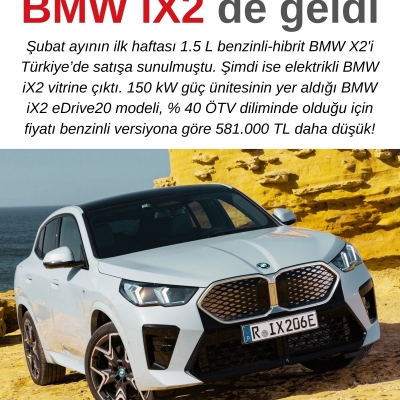 Şubat ayının ilk haftası 1.5 L benzinli-hibrit BMW X2'i Türkiye’de satışa sunulmuştu. Şimdi ise elektrikli BMW iX2 vitrine çıktı. 150 kW güç ünitesinin yer aldığı BMW iX2 eDrive20 modeli, % 40 ÖTV diliminde olduğu için fiyatı benzinli versiyona göre 581.000 TL daha düşük!
