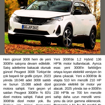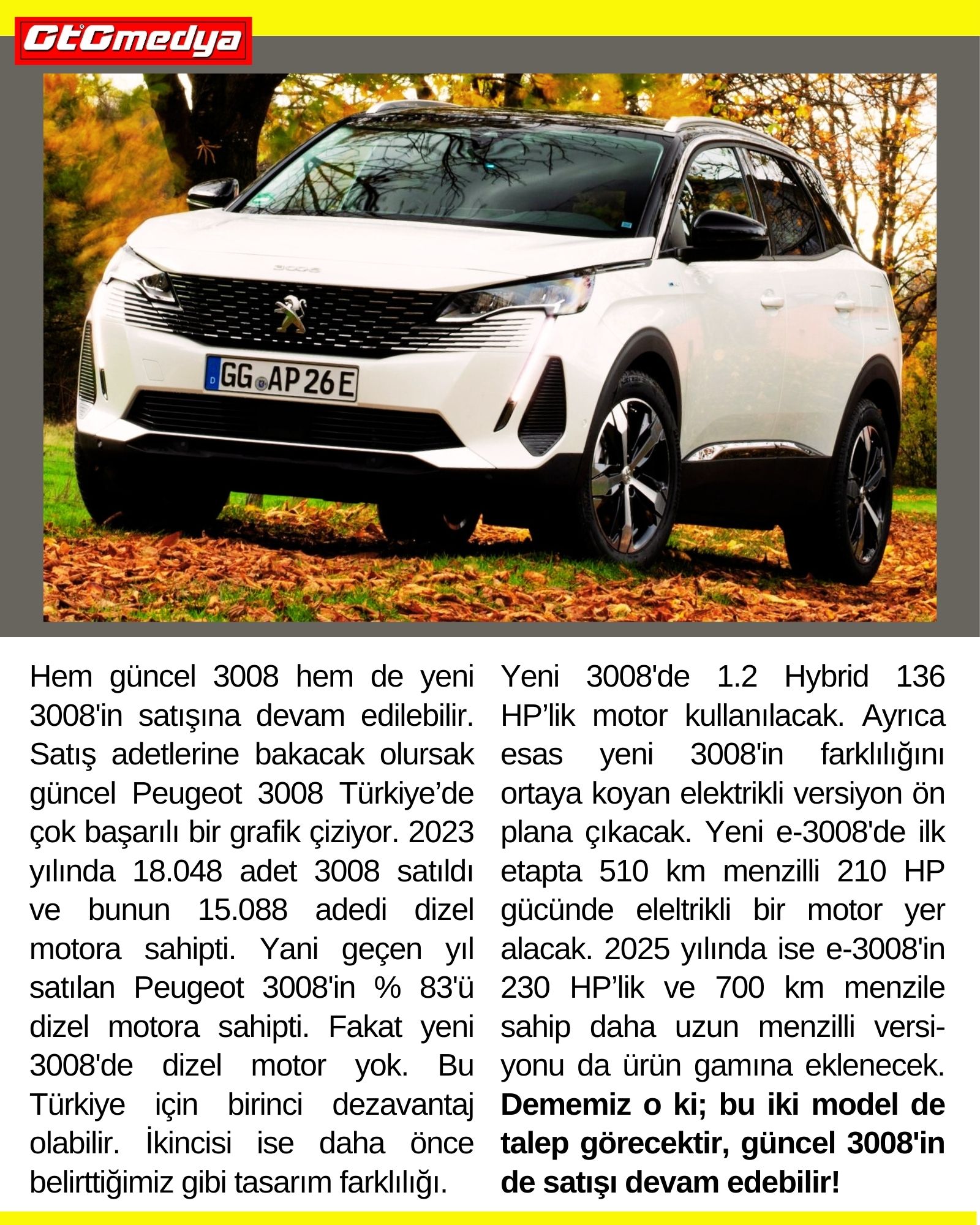 Hem güncel 3008 hem de yeni 3008'in satışına devam edilebilir. Satış adetlerine bakacak olursak güncel Peugeot 3008 Türkiye’de çok başarılı bir grafik çiziyor. 2023 yılında 18.048 adet 3008 satıldı ve bunun 15.088 adedi dizel motora sahipti. Yani geçen yıl satılan Peugeot 3008'in % 83'ü dizel motora sahipti. Fakat yeni 3008'de dizel motor yok. Bu Türkiye için birinci dezavantaj olabilir. İkincisi ise daha önce belirttiğimiz gibi tasarım farklılığı.