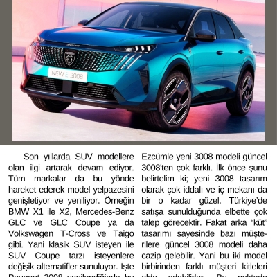 Son yıllarda SUV modellere olan ilgi artarak devam ediyor. Tüm markalar da bu yönde hareket ederek model yelpazesini genişletiyor ve yeniliyor. Örneğin BMW X1 ile X2, Mercedes-Benz GLC ve GLC Coupe ya da Volkswagen T-Cross ve Taigo gibi. Yani klasik SUV isteyen ile SUV Coupe tarzı isteyenlere değişik alternatifler sunuluyor. İşte Peugeot 3008 yenilendiğinde bu fikir geldi aklımıza. Çünkü yeni 3008 modeli coupe tarzında.
