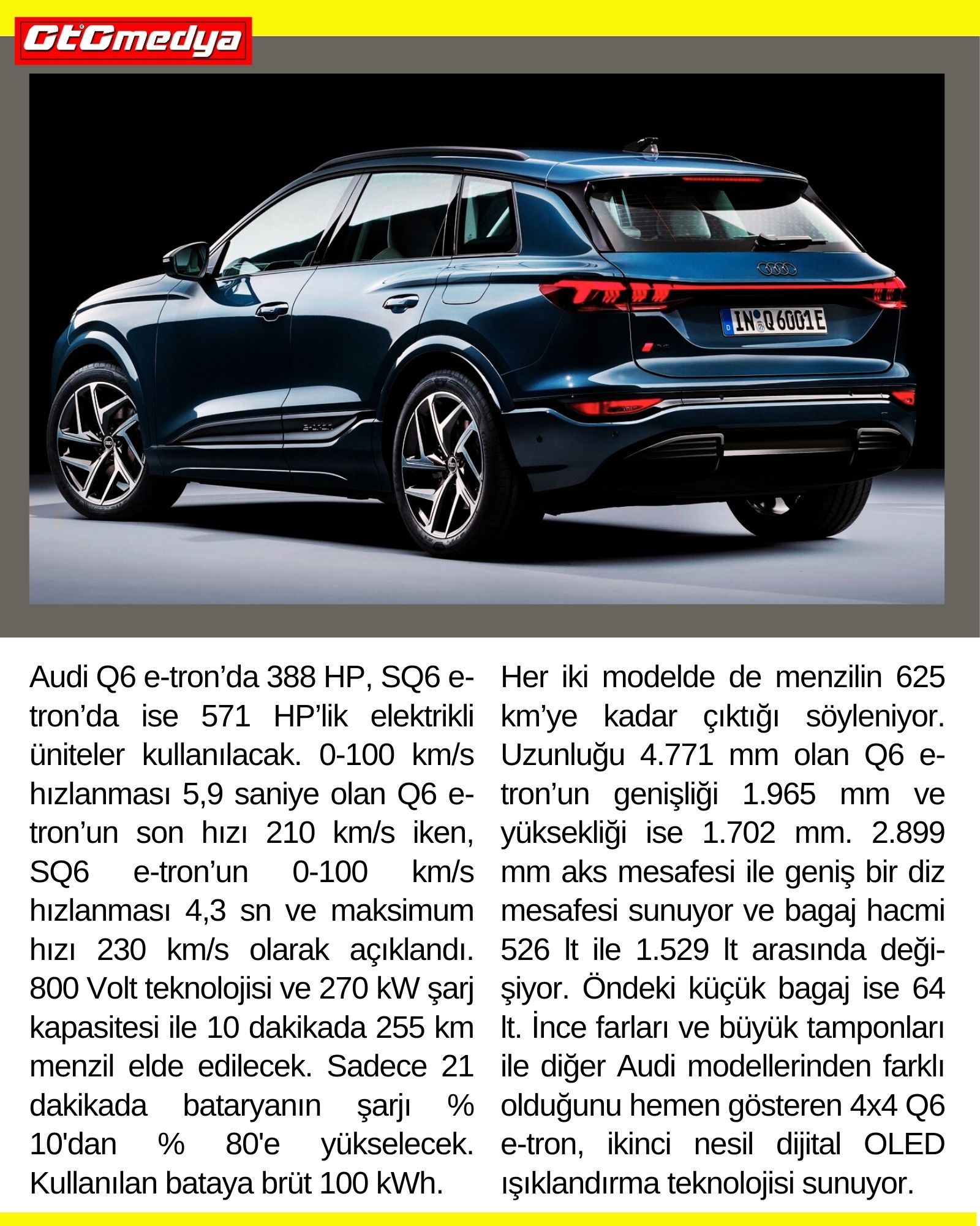 Her iki modelde de menzilin 625 km’ye kadar çıktığı söyleniyor. Uzunluğu 4.771 mm olan Q6 e-tron’un genişliği 1.965 mm ve yüksekliği ise 1.702 mm. 2.899 mm aks mesafesi ile geniş bir diz mesafesi sunuyor ve bagaj hacmi 526 lt ile 1.529 lt arasında değişiyor. Öndeki küçük bagaj ise 64 lt. İnce farları ve büyük tamponları ile diğer Audi modellerinden farklı olduğunu hemen gösteren 4x4 Q6 e-tron, ikinci nesil dijital OLED ışıklandırma teknolojisi sunuyor.