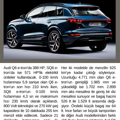 Almanya’da Porsche Macan’dan 10.000 Euro daha ucuz satılacak olan Audi Q6 e-tron, bakalım Türkiye’de kaça satılacak? Motor gücünden dolayı % 60 ÖTV dilimine gireceği için küçük bir hesaplama ile (Almanya çıkışını 70.000 Euro olarak kabul edersek!) Türkiye fiyatı 135.000 Euro’yu bulacak gibi. Bu da yaklaşık 5.000.000 TL anlamına geliyor. Q8 e-tron bizde 6.771.570 TL’ye satıldığı için bu tahminimiz doğru çıkabilir.