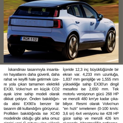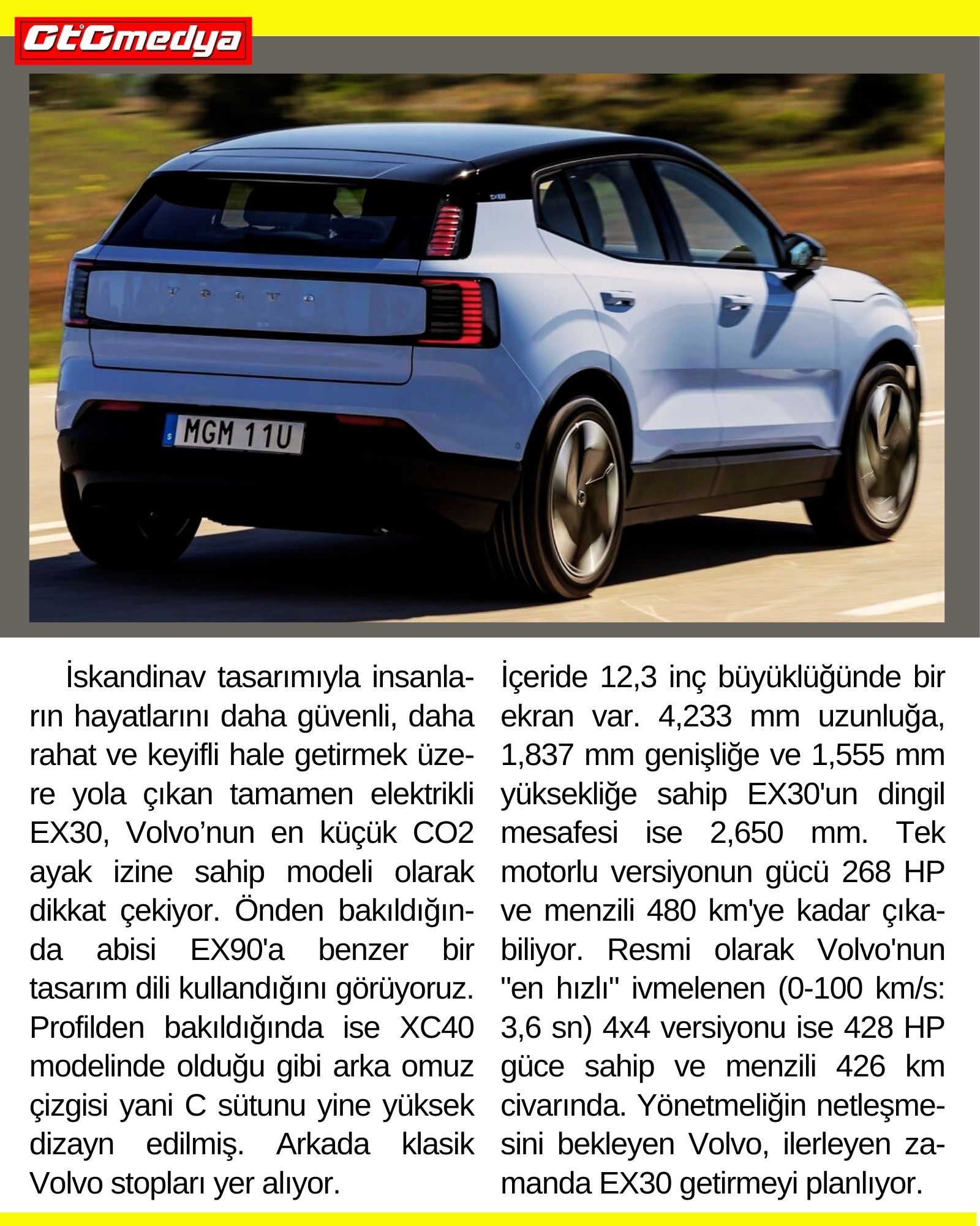 İçeride 12,3 inç büyüklüğünde bir ekran var. 4,233 mm uzunluğa, 1,837 mm genişliğe ve 1,555 mm yüksekliğe sahip EX30'un dingil mesafesi ise 2,650 mm. Tek motorlu versiyonun gücü 268 HP ve menzili 480 km'ye kadar çıka-biliyor. Resmi olarak Volvo'nun "en hızlı" ivmelenen (0-100 km/s: 3,6 sn) 4x4 versiyonu ise 428 HP güce sahip ve menzili 426 km civarında. Yönetmeliğin netleşme-sini bekleyen Volvo, ilerleyen za-manda EX30 getirmeyi planlıyor.