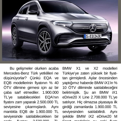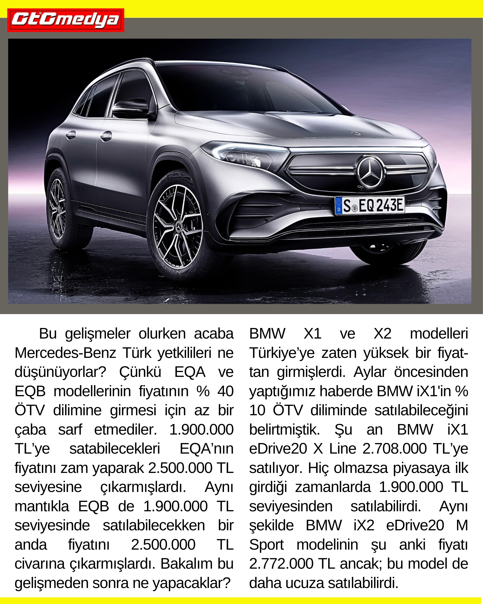 Bu gelişmeler olurken acaba Mercedes-Benz Türk yetkilileri ne düşünüyorlar? Çünkü EQA ve EQB modellerinin fiyatının % 40 ÖTV dilimine girmesi için az bir çaba sarf etmediler. 1.900.000 TL’ye satabilecekleri EQA’nın fiyatını zam yaparak 2.500.000 TL seviyesine çıkarmışlardı. Aynı mantıkla EQB de 1.900.000 TL seviyesinde satılabilecekken bir anda fiyatını 2.500.000 TL civarına çıkarmışlardı. Bakalım bu gelişmeden sonra ne yapacaklar?