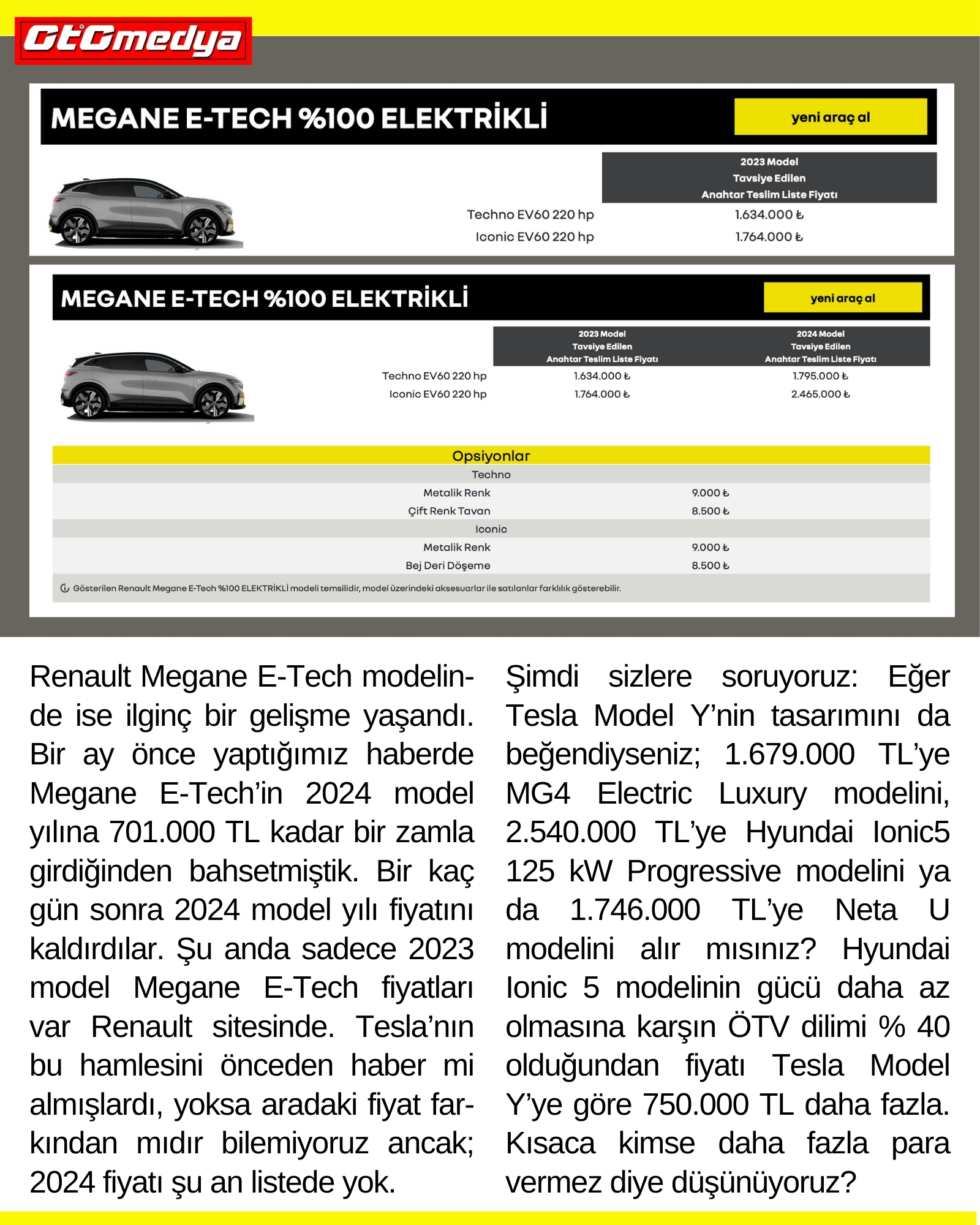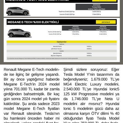 Renault Megane E-Tech modelinde ise ilginç bir gelişme yaşandı. Bir ay önce yaptığımız haberde Megane E-Tech’in 2024 model yılına 701.000 TL kadar bir zamla girdiğinden bahsetmiştik. Bir kaç gün sonra 2024 model yılı fiyatını kaldırdılar. Şu anda sadece 2023 model Megane E-Tech fiyatları var Renault sitesinde. Tesla’nın bu hamlesini önceden haber mi almışlardı, yoksa aradaki fiyat far-kından mıdır bilemiyoruz ancak; 2024 fiyatı şu an listede yok.