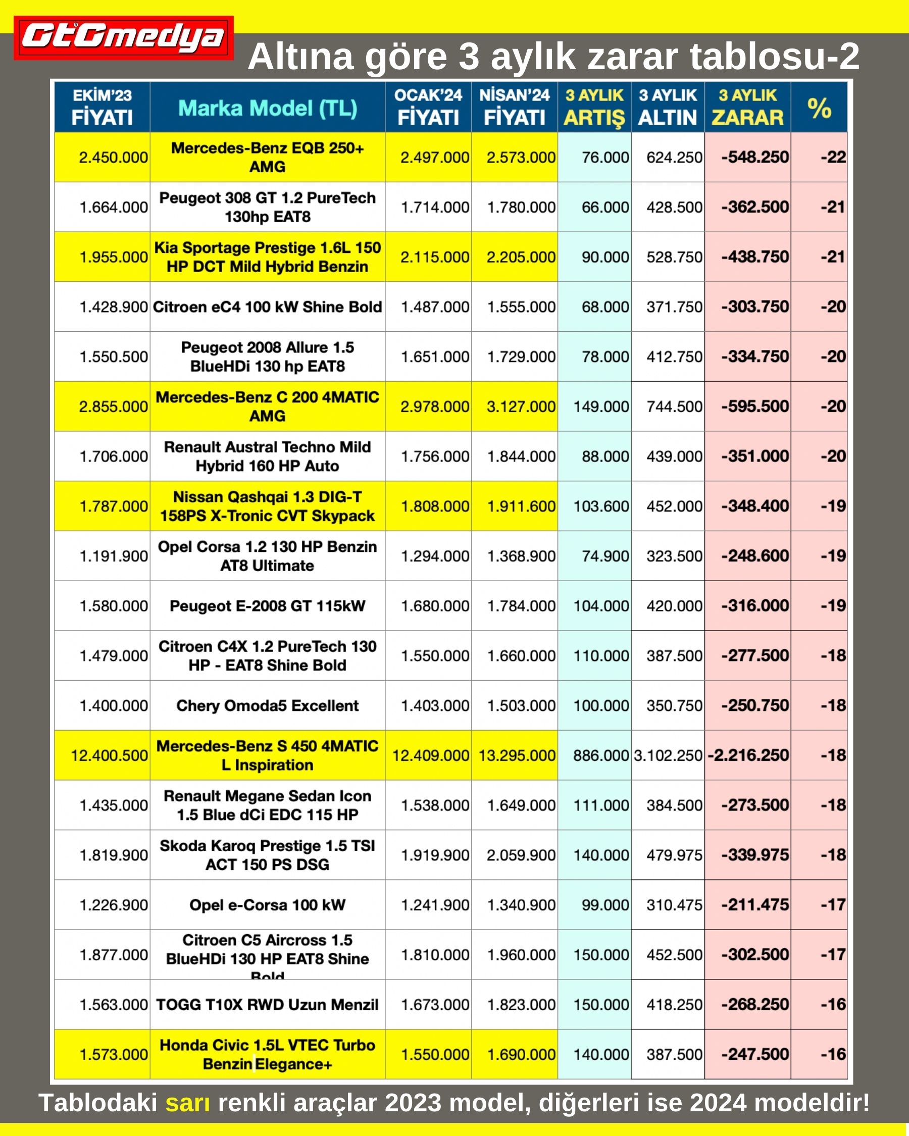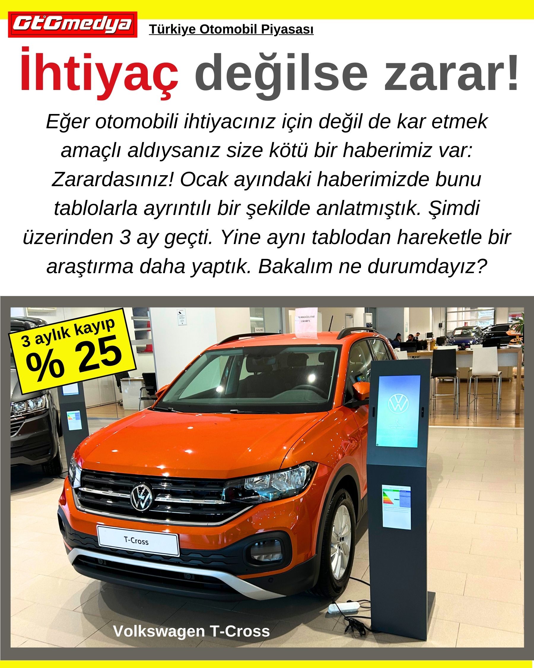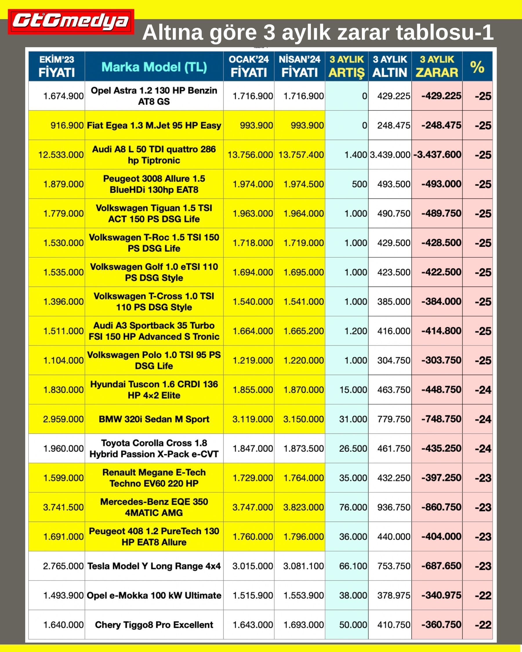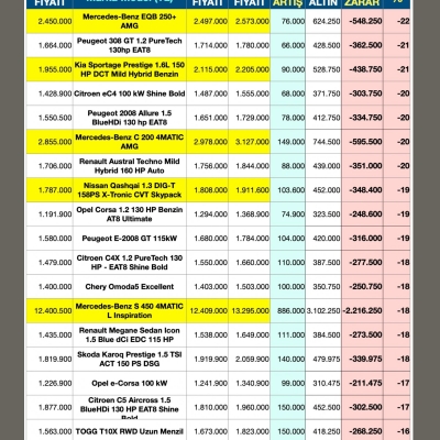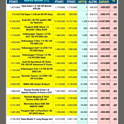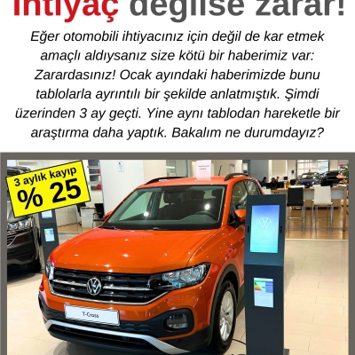Eğer otomobili ihtiyacınız için değil de kar etmek amaçlı aldıysanız size kötü bir haberimiz var: Zarardasınız! Ocak ayındaki haberimizde bunu tablolarla ayrıntılı bir şekilde anlatmıştık. Şimdi üzerinden 3 ay geçti. Yine aynı tablodan hareketle bir araştırma daha yaptık. Bakalım ne durumdayız?