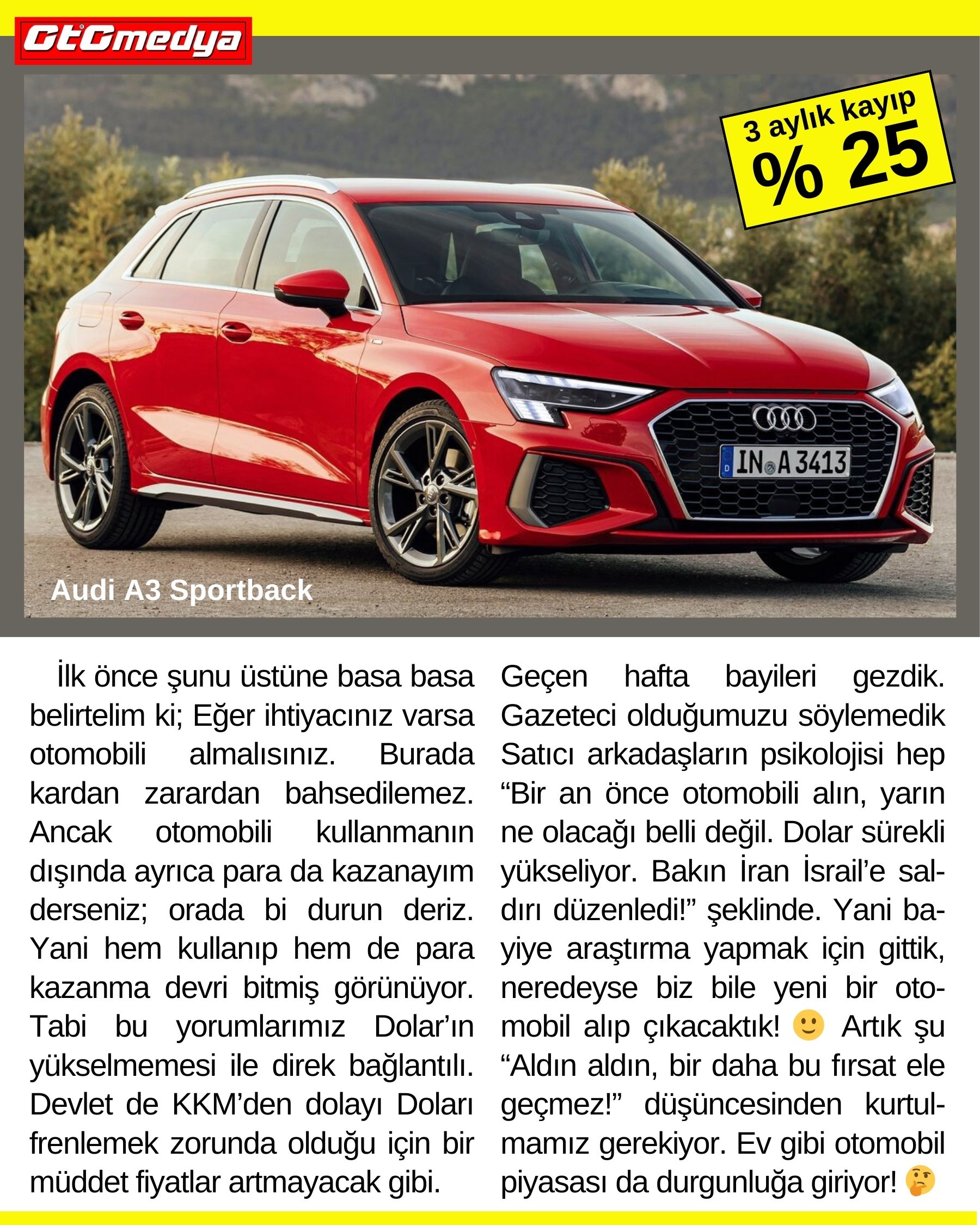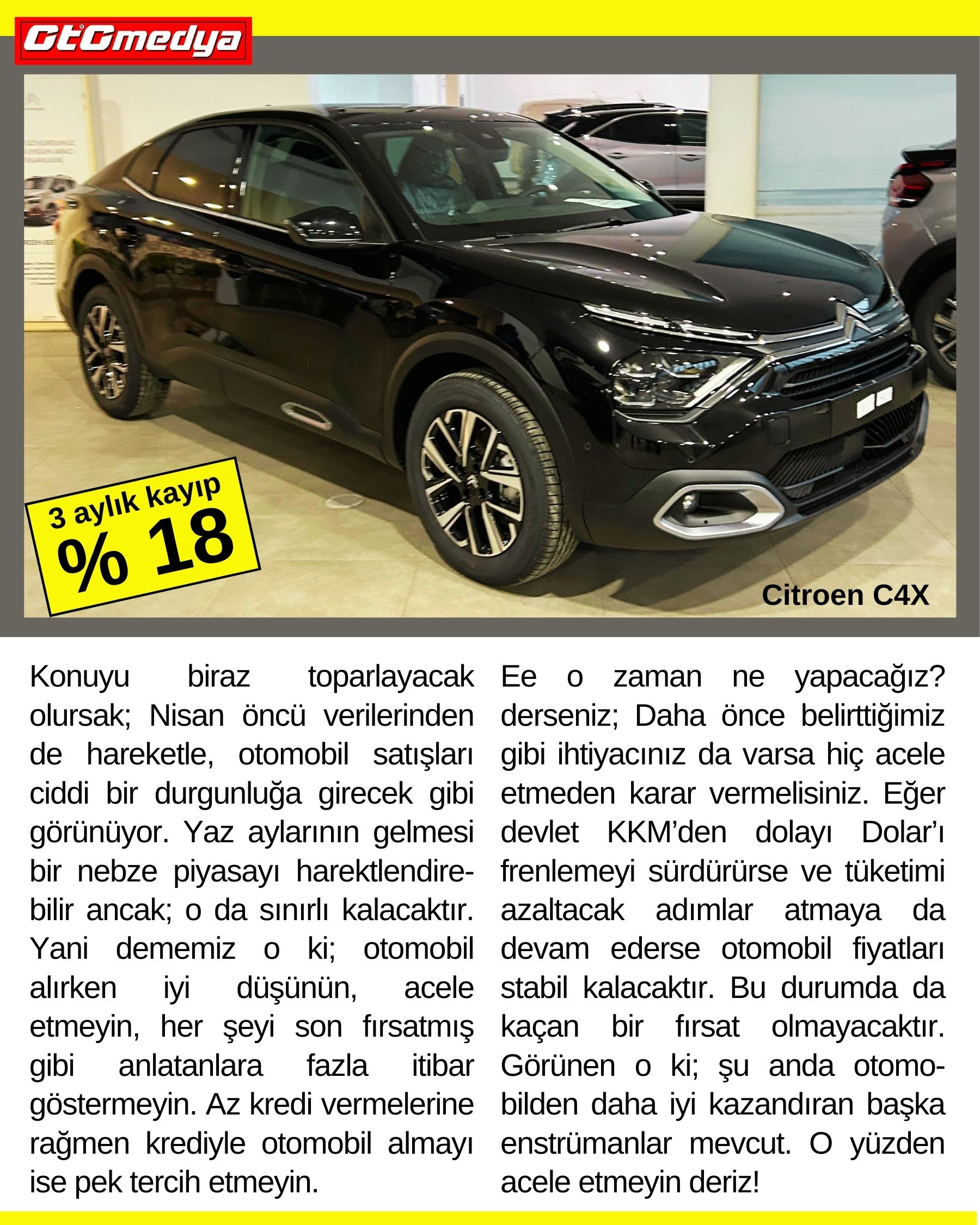 Ee o zaman ne yapacağız? derseniz; Daha önce belirttiğimiz gibi ihtiyacınız da varsa hiç acele etmeden karar vermelisiniz. Eğer devlet KKM’den dolayı Dolar’ı frenlemeyi sürdürürse ve tüketimi azaltacak adımlar atmaya da devam ederse otomobil fiyatları stabil kalacaktır. Bu durumda da kaçan bir fırsat olmayacaktır. Görünen o ki; şu anda otomo-bilden daha iyi kazandıran başka enstrümanlar mevcut. O yüzden acele etmeyin deriz!