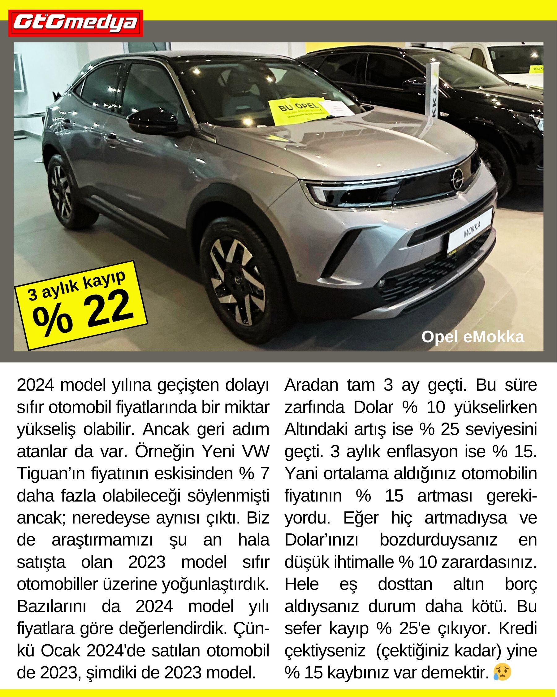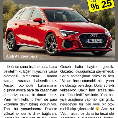 Aradan tam 3 ay geçti. Bu süre zarfında Dolar % 10 yükselirken Altındaki artış ise % 25 seviyesini geçti. 3 aylık enflasyon ise % 15. Yani ortalama aldığınız otomobilin fiyatının % 15 artması gerekiyordu. Eğer hiç artmadıysa ve Dolar’ınızı bozdurduysanız en düşük ihtimalle % 10 zarardasınız. Hele eş dosttan altın borç aldıysanız durum daha kötü. Bu sefer kayıp % 25'e çıkıyor. Kredi çektiyseniz (çektiğiniz kadar) yine % 15 kaybınız var demektir.