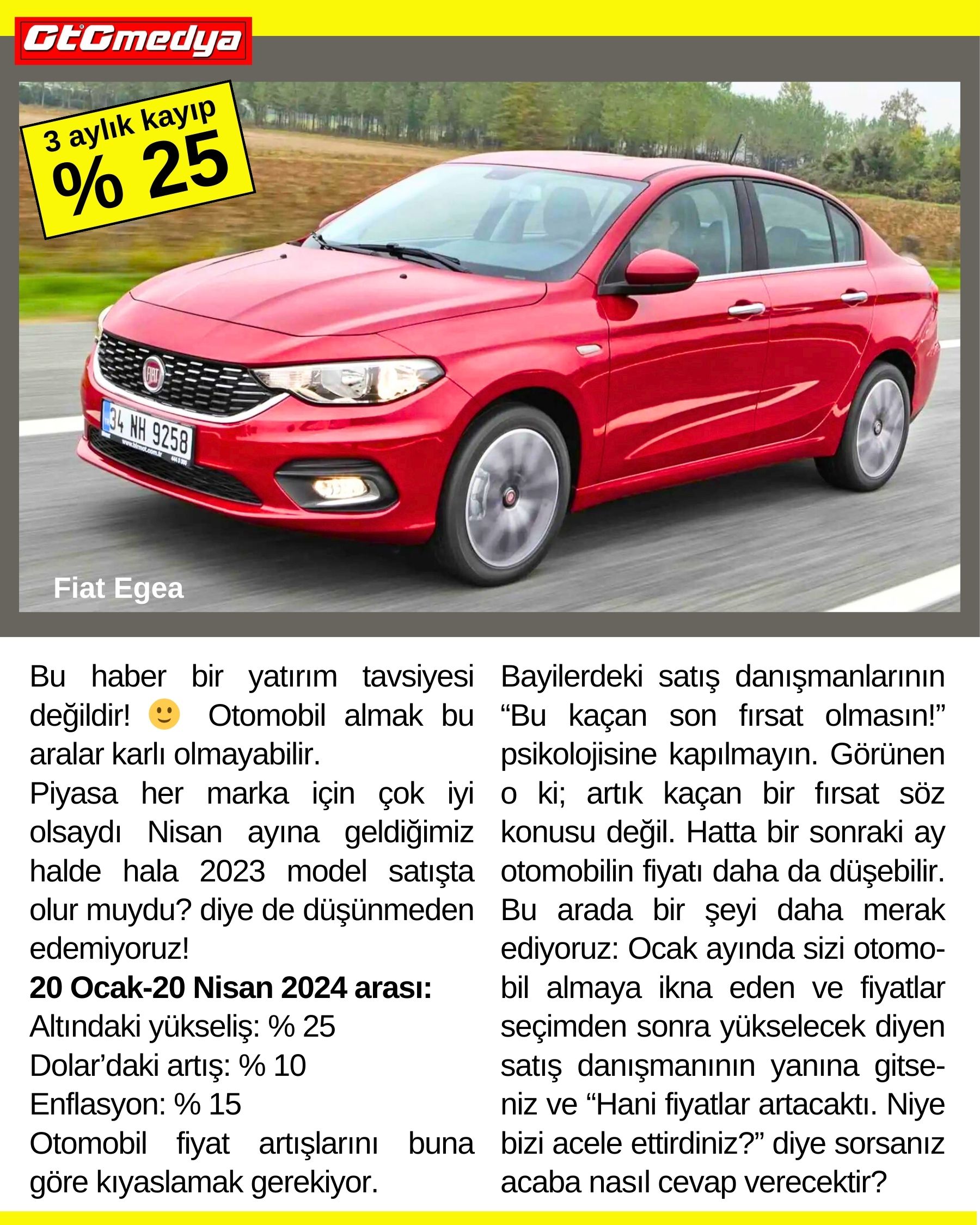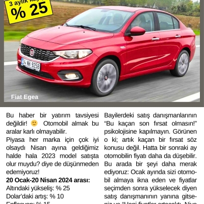 İlk önce şunu üstüne basa basa belirtelim ki; Eğer ihtiyacınız varsa otomobili almalısınız. Burada kardan zarardan bahsedilemez. Ancak otomobili kullanmanın dışında ayrıca para da kazanayım derseniz; orada bi durun deriz. Yani hem kullanıp hem de para kazanma devri bitmiş görünüyor. Tabi bu yorumlarımız Dolar’ın yükselmemesi ile direk bağlantılı. Devlet de KKM’den dolayı Doları frenlemek zorunda olduğu için bir müddet fiyatlar artmayacak gibi.