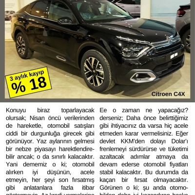 Konuyu biraz toparlayacak olursak; Nisan öncü verilerinden de hareketle, otomobil satışları ciddi bir durgunluğa girecek gibi görünüyor. Yaz aylarının gelmesi bir nebze piyasayı harektlendirebilir ancak; o da sınırlı kalacaktır. Yani dememiz o ki; otomobil alırken iyi düşünün, acele etmeyin, her şeyi son fırsatmış gibi anlatanlara fazla itibar göstermeyin. Az kredi vermelerine rağmen krediyle otomobil almayı ise pek tercih etmeyin.