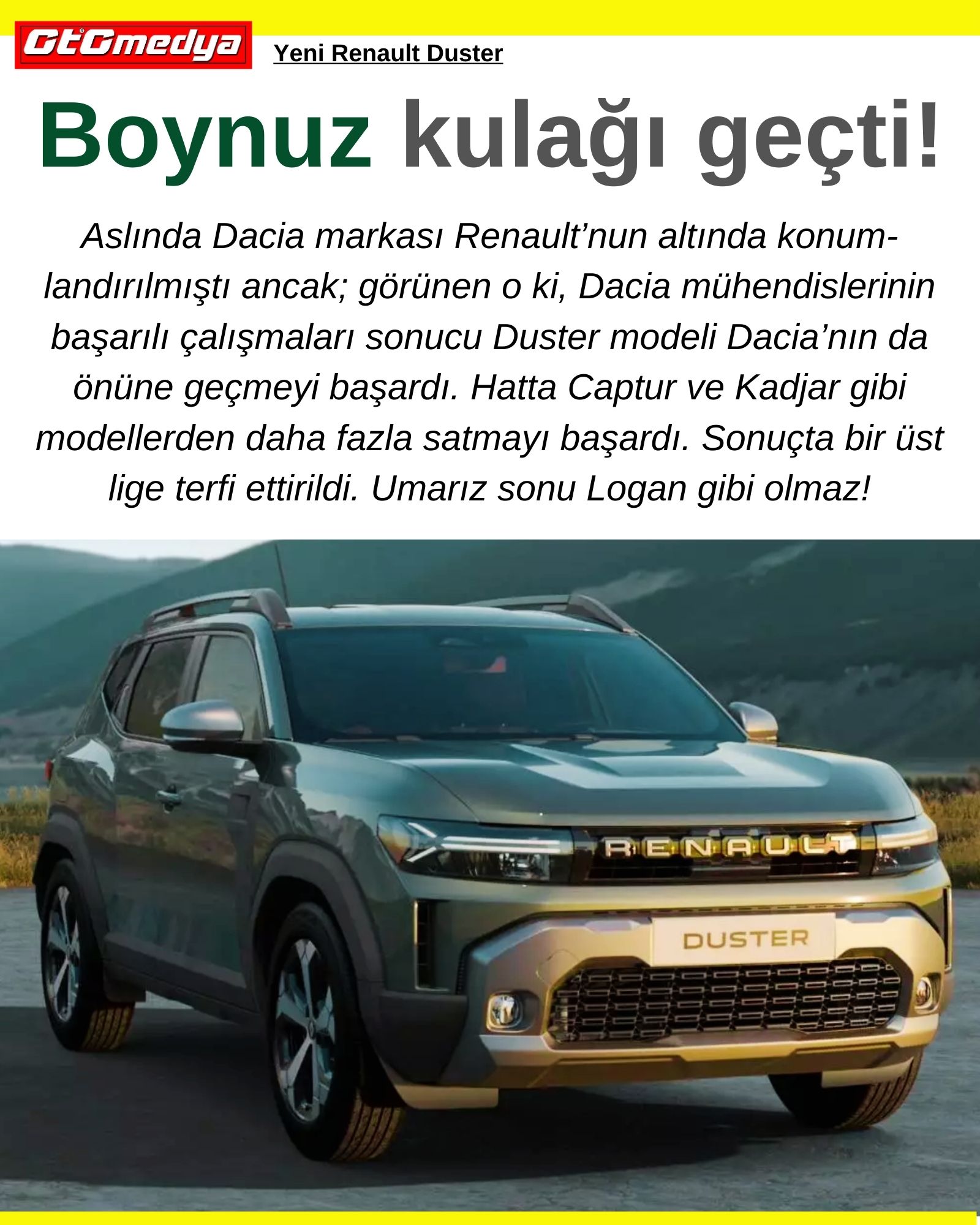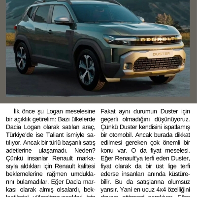 Aslında Dacia markası Renault’nun altında konumlandırılmıştı ancak; görünen o ki, Dacia mühendislerinin başarılı çalışmaları sonucu Duster modeli Dacia’nın da önüne geçmeyi başardı. Hatta Captur ve Kadjar gibi modellerden daha fazla satmayı başardı. Sonuçta bir üst lige terfi ettirildi. Umarız sonu Logan gibi olmaz!